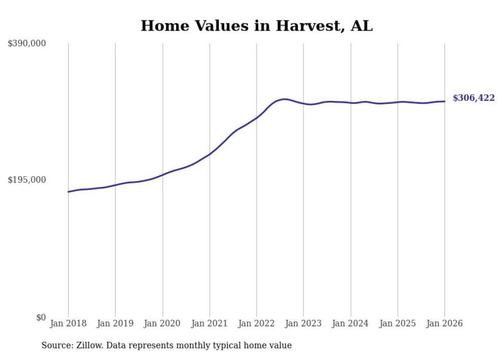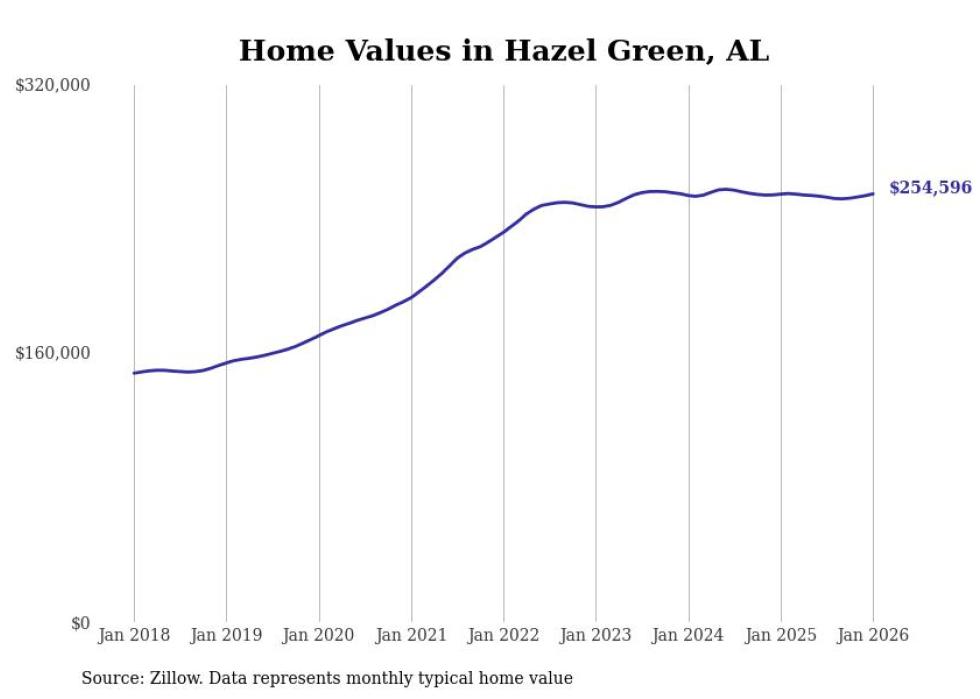 Stacker compiled a list of cities with the most expensive homes in the Huntsville metro area using data from Zillow. Charts show the monthly typical home value since January 2018. All 13 cities and towns with data available were included in the list.