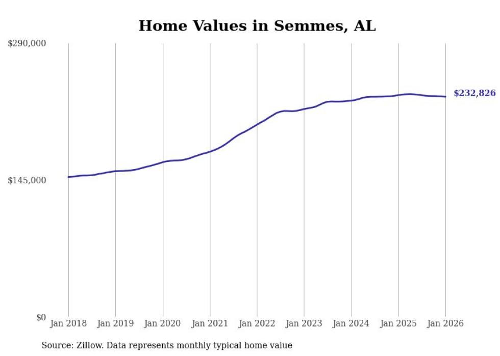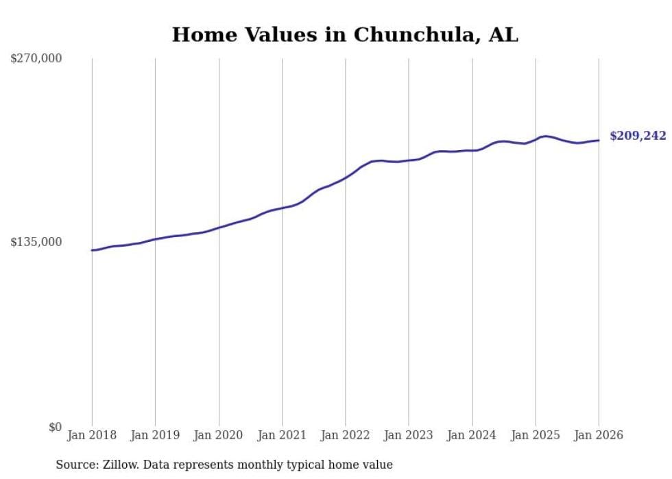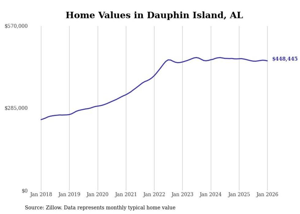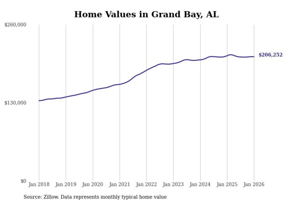Stacker compiled a list of cities with the most expensive homes in the Mobile metro area using data from Zillow. Charts show the monthly typical home value since January 2018. All 21 cities and towns with data available were included in the list.