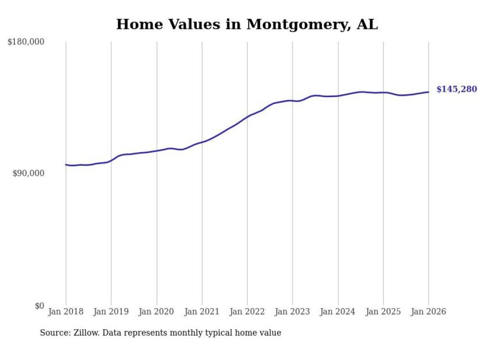Stacker compiled a list of cities with the most expensive homes in the Montgomery metro area using data from Zillow. Charts show the monthly typical home value since January 2018. All 21 cities and towns with data available were included in the list.