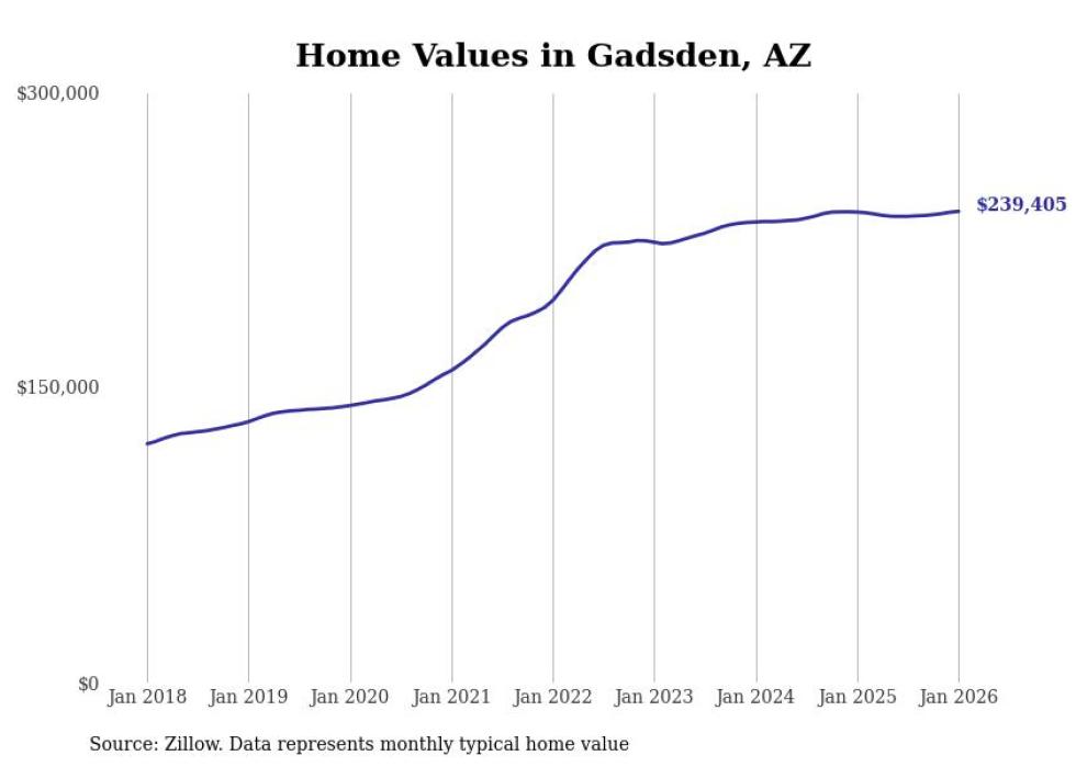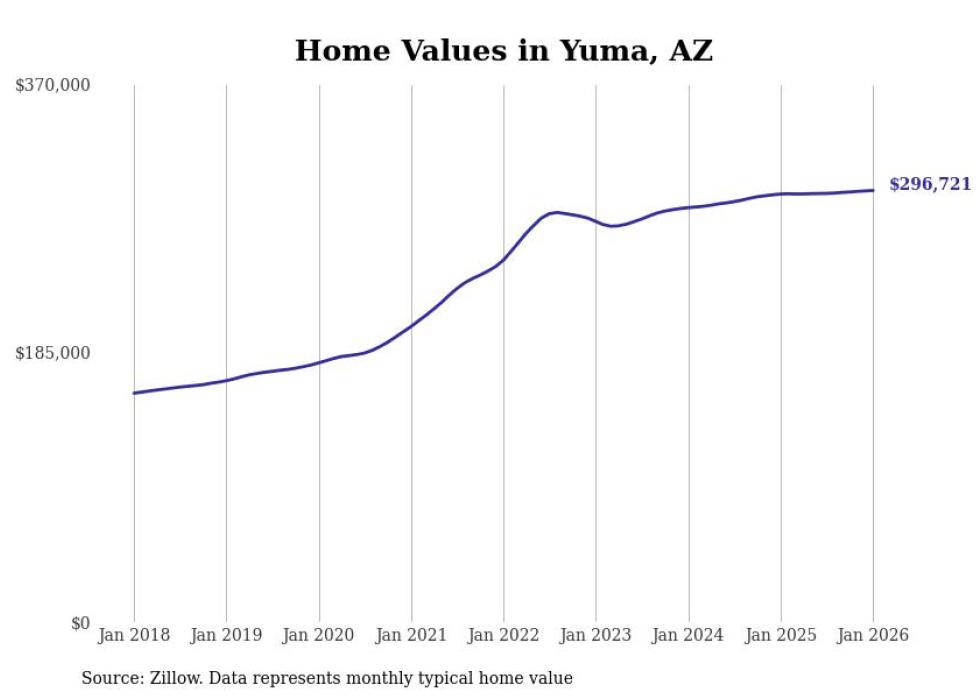Stacker compiled a list of cities with the most expensive homes in the Yuma metro area using data from Zillow. Charts show the monthly typical home value since January 2018. All 5 cities and towns with data available were included in the list.