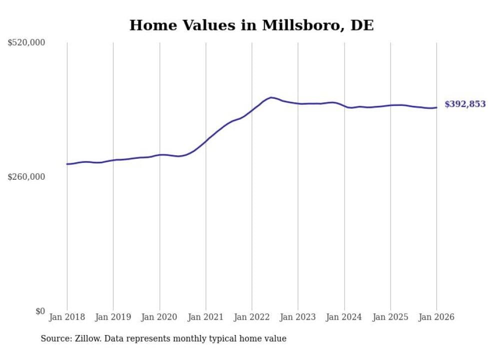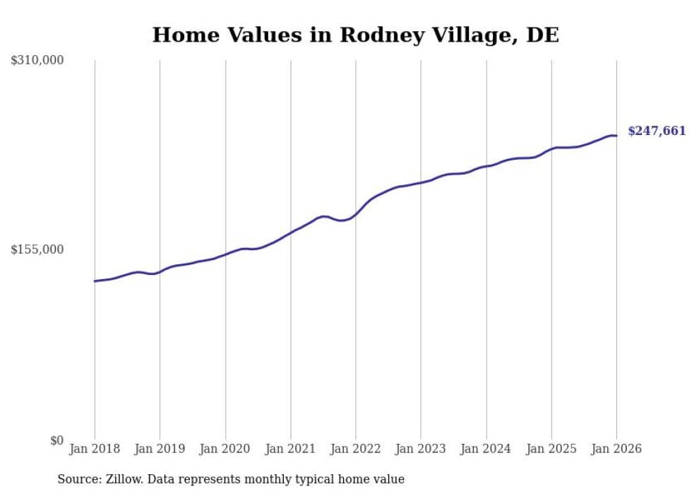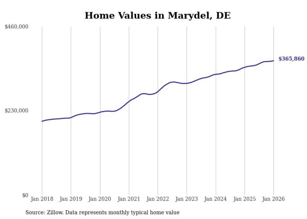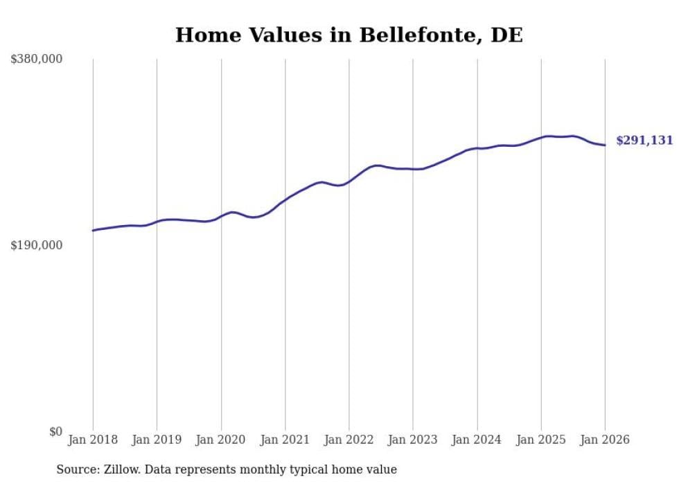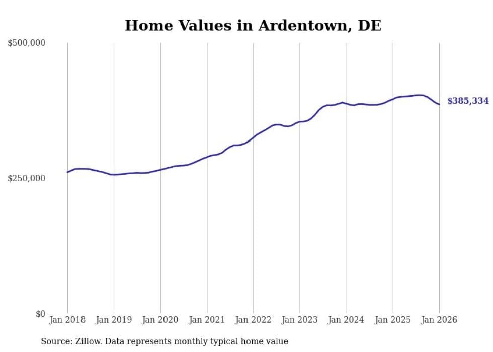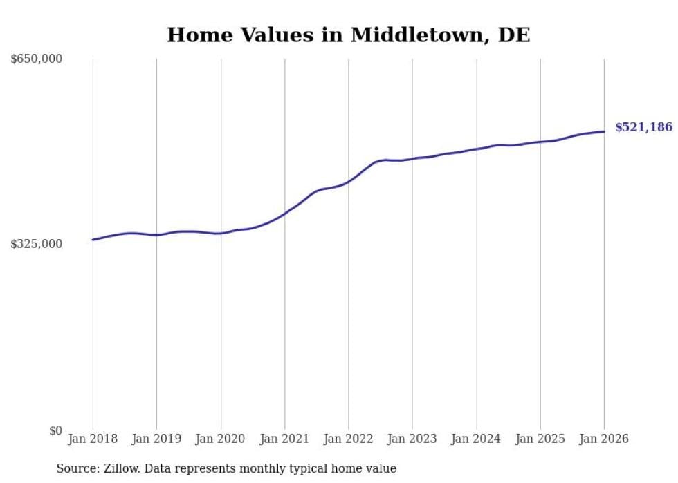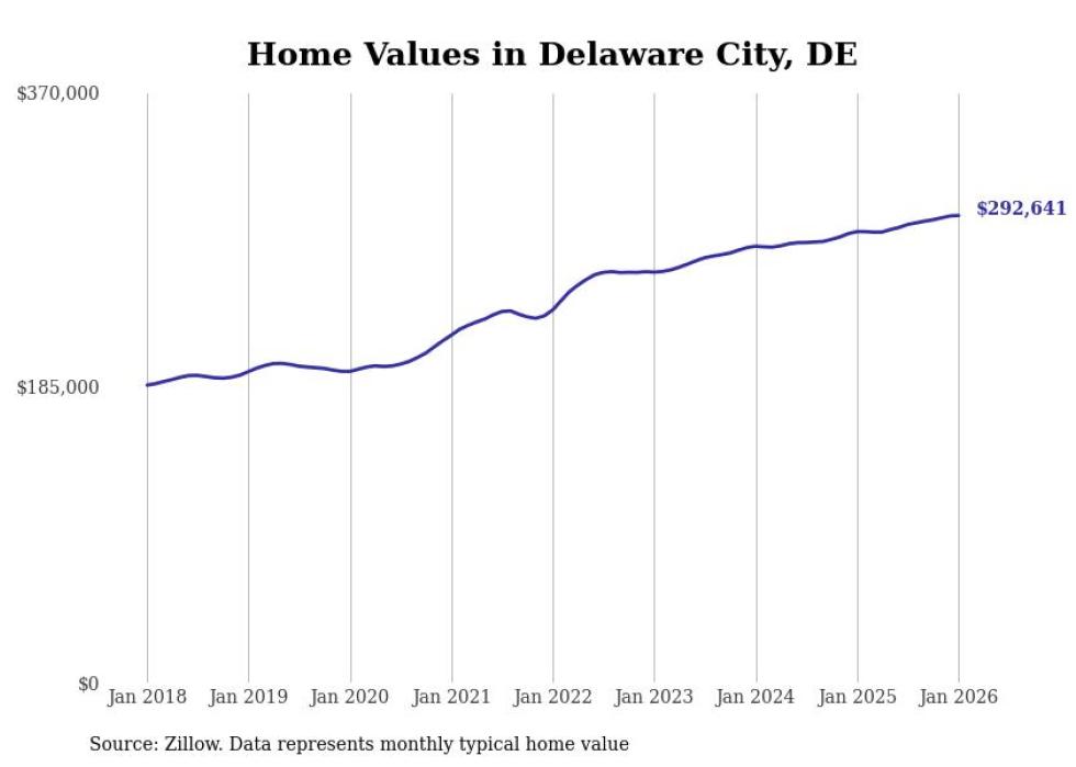 Stacker compiled a list of cities with the fastest-growing home prices in Delaware using data from Zillow. Cities are ranked by the dollar change in the Zillow Home Values Index for all homes from the 12 months ending January 2026. The charts in this story were created automatically using Matplotlib. Data was available for 50 cities and towns in Delaware.
