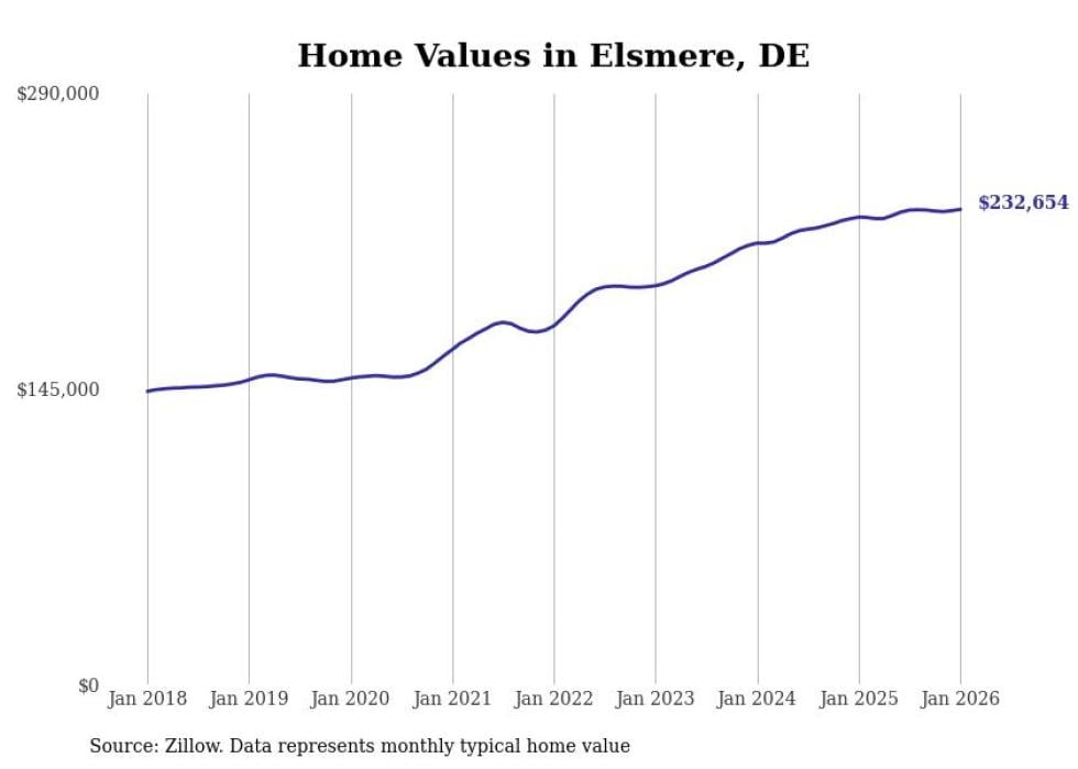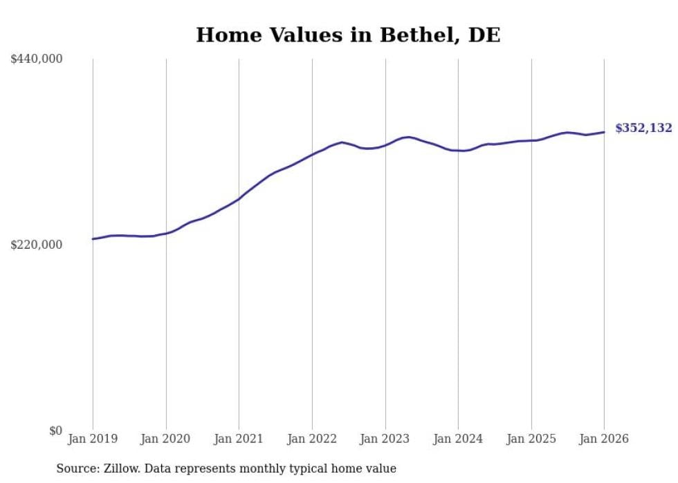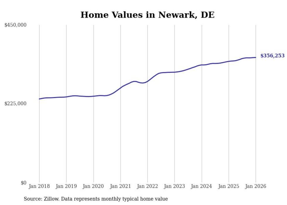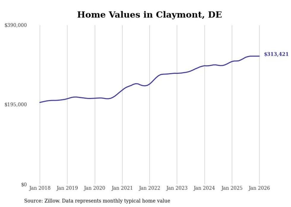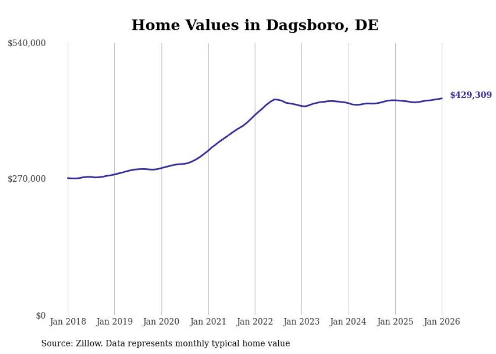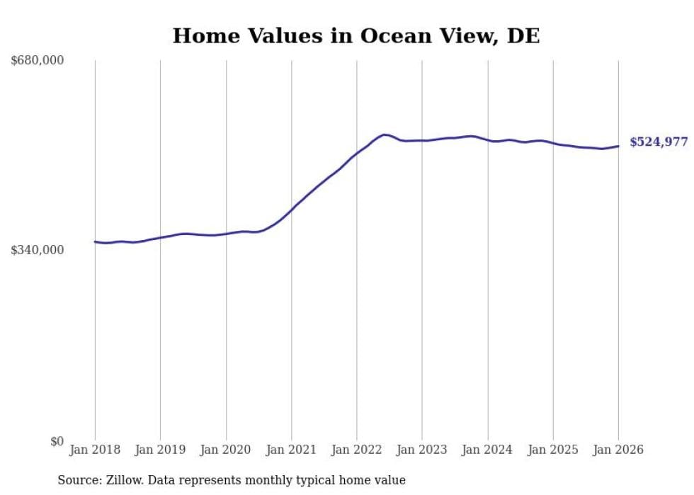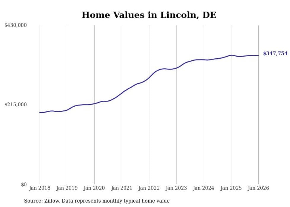 Stacker compiled a list of cities with the fastest-growing home prices in Delaware using data from Zillow. Cities are ranked by the dollar change in the Zillow Home Values Index for all homes from the 12 months ending January 2026. The charts in this story were created automatically using Matplotlib. Data was available for 50 cities and towns in Delaware.