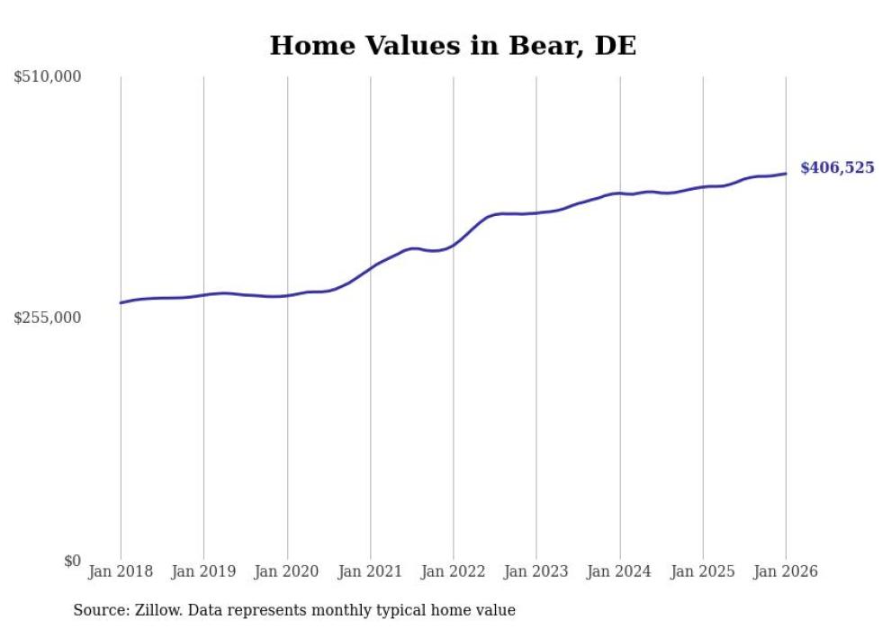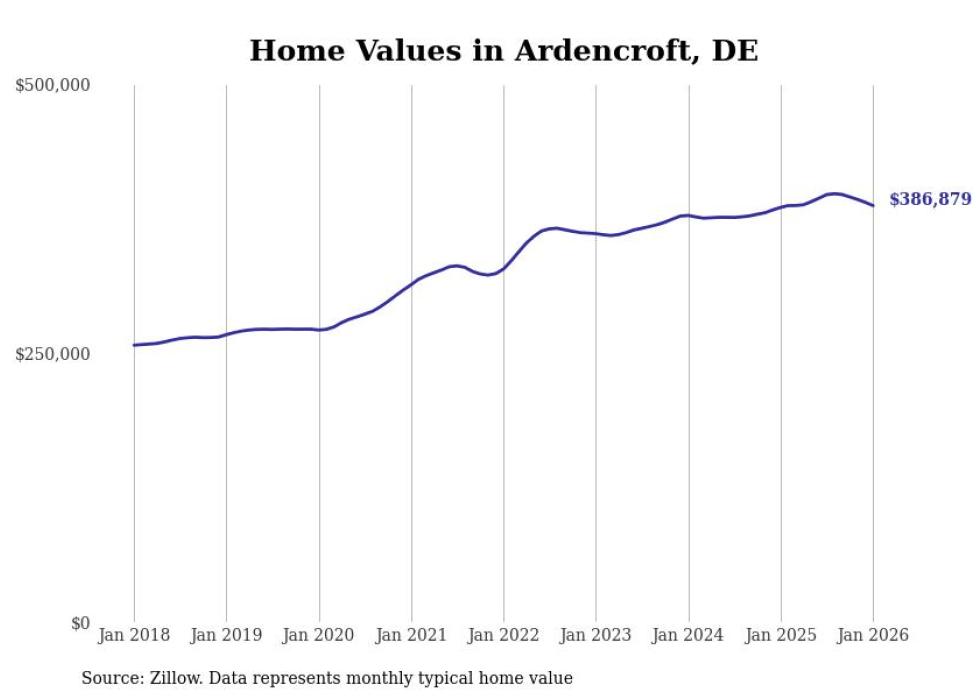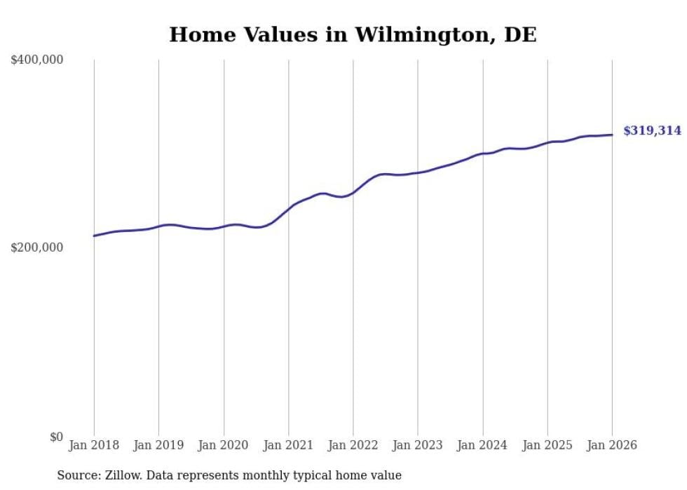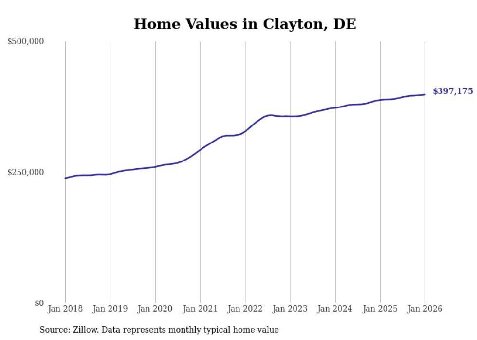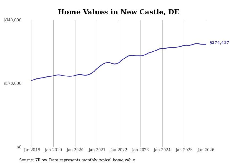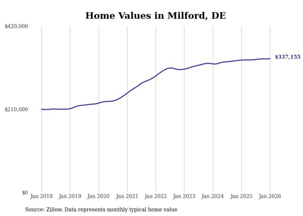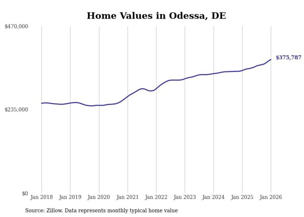 Stacker compiled a list of cities with the fastest-growing home prices in Delaware using data from Zillow. Cities are ranked by the dollar change in the Zillow Home Values Index for all homes from the 12 months ending January 2026. The charts in this story were created automatically using Matplotlib. Data was available for 50 cities and towns in Delaware.