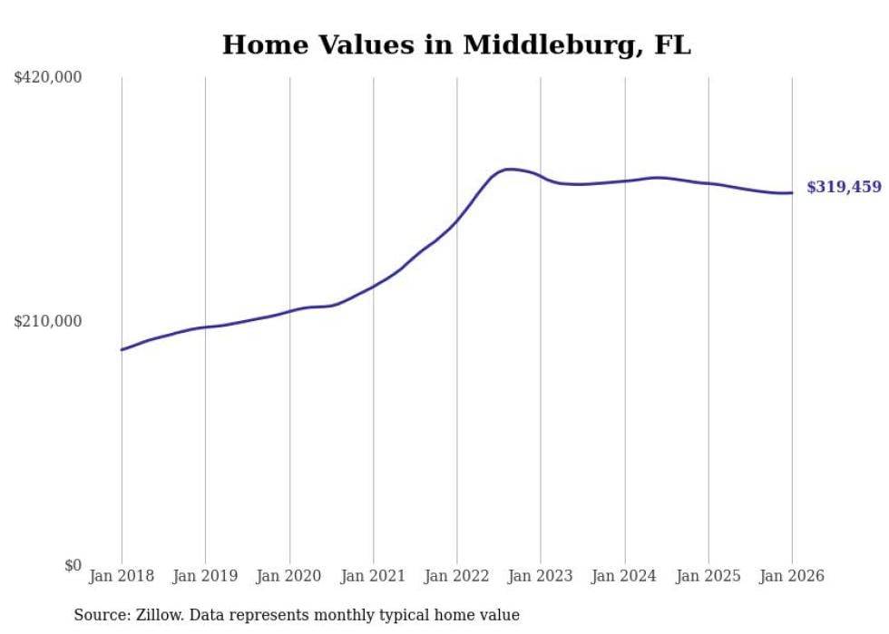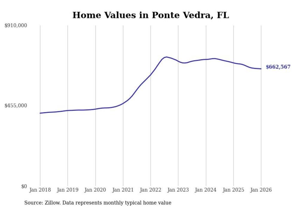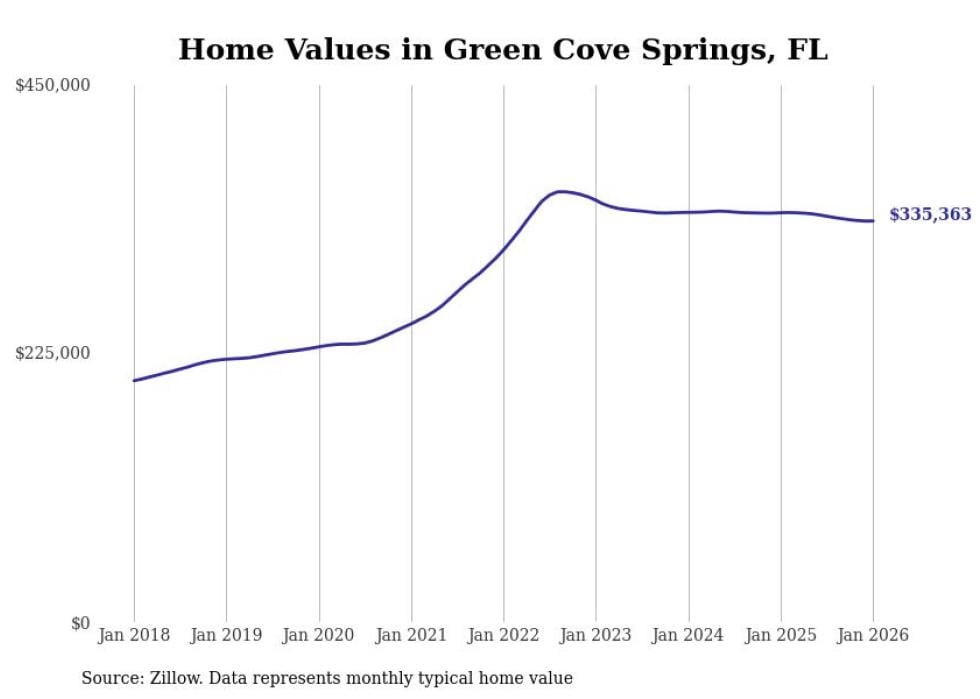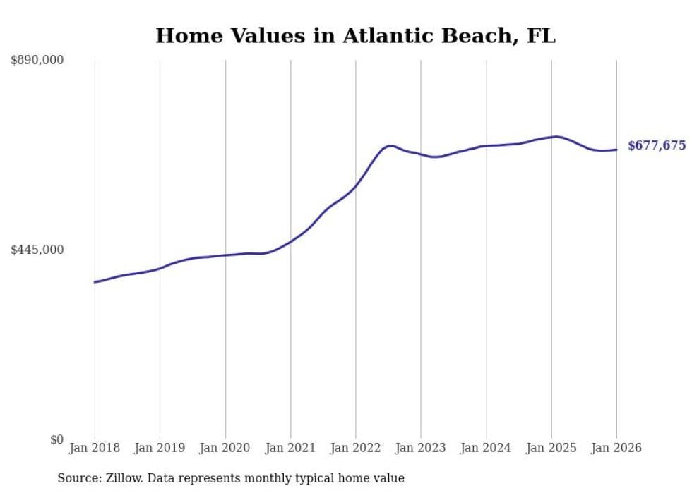 Stacker compiled a list of cities with the most expensive homes in the Jacksonville metro area using data from Zillow. Charts show the monthly typical home value since January 2018. All 27 cities and towns with data available were included in the list.