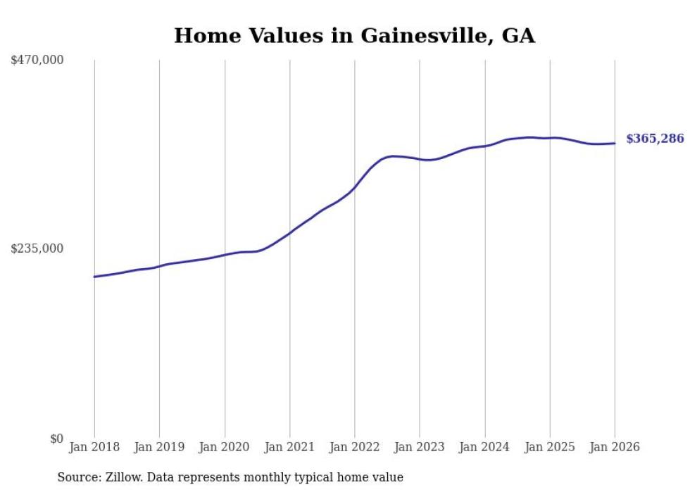 Stacker compiled a list of cities with the most expensive homes in the Gainesville, Georgia metro area using data from Zillow. Charts show the monthly typical home value since January 2018. All 7 cities and towns with data available were included in the list.