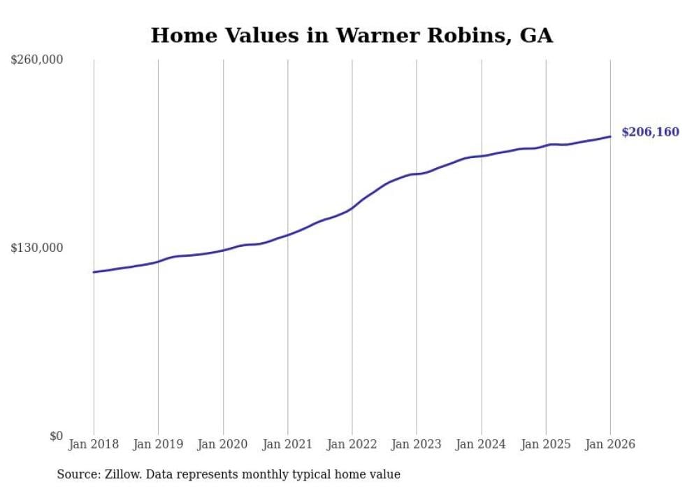 Stacker compiled a list of cities with the most expensive homes in the Warner Robins metro area using data from Zillow. Charts show the monthly typical home value since January 2018. All 9 cities and towns with data available were included in the list.