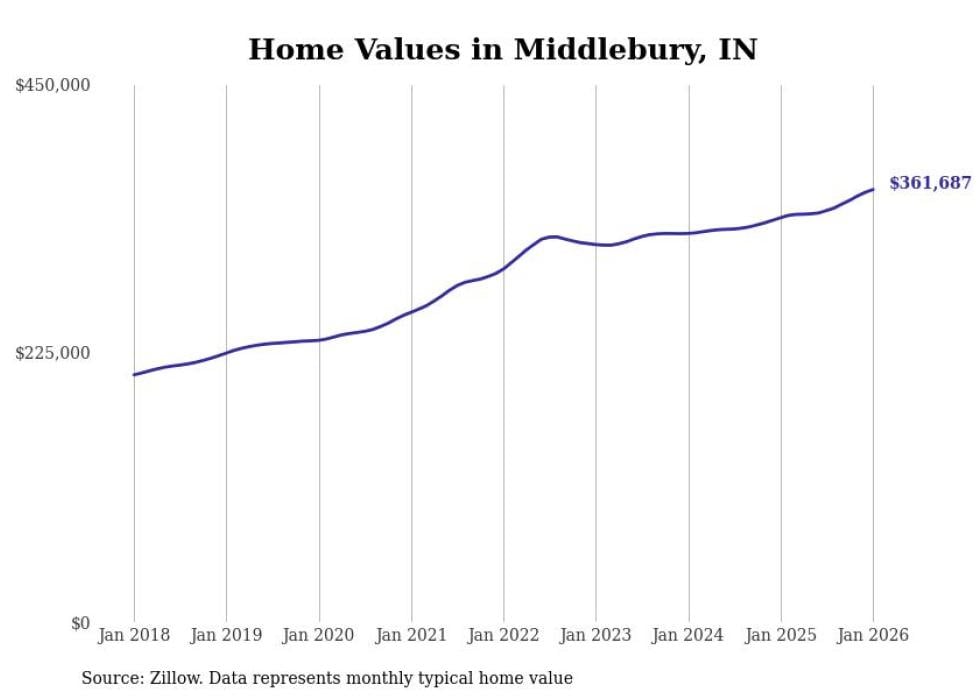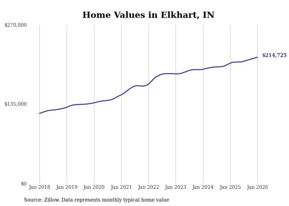 Stacker compiled a list of cities with the most expensive homes in the Elkhart metro area using data from Zillow. Charts show the monthly typical home value since January 2018. All 7 cities and towns with data available were included in the list.