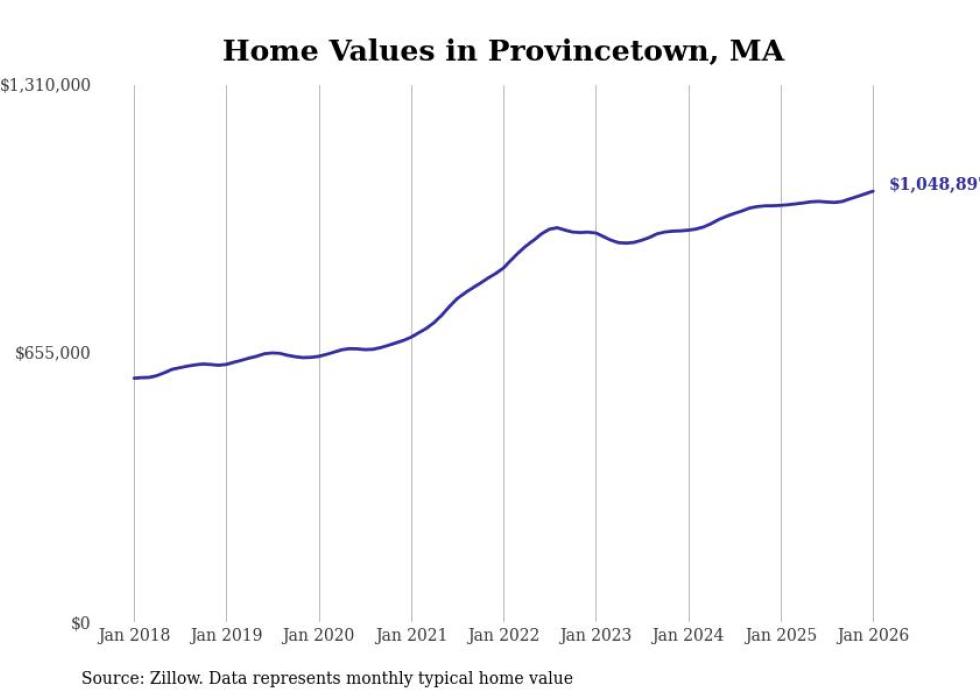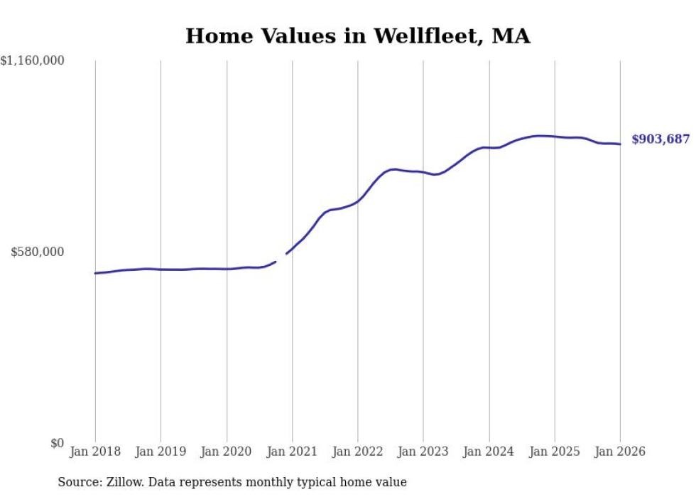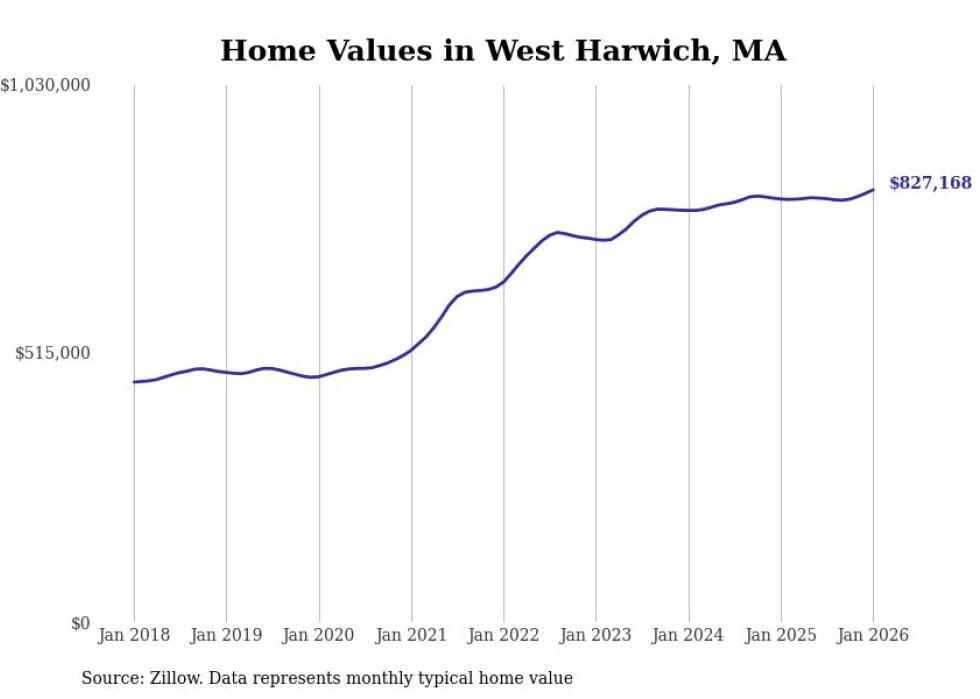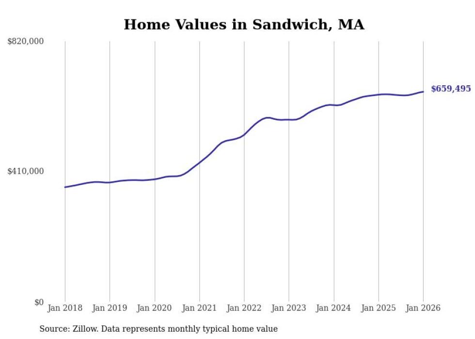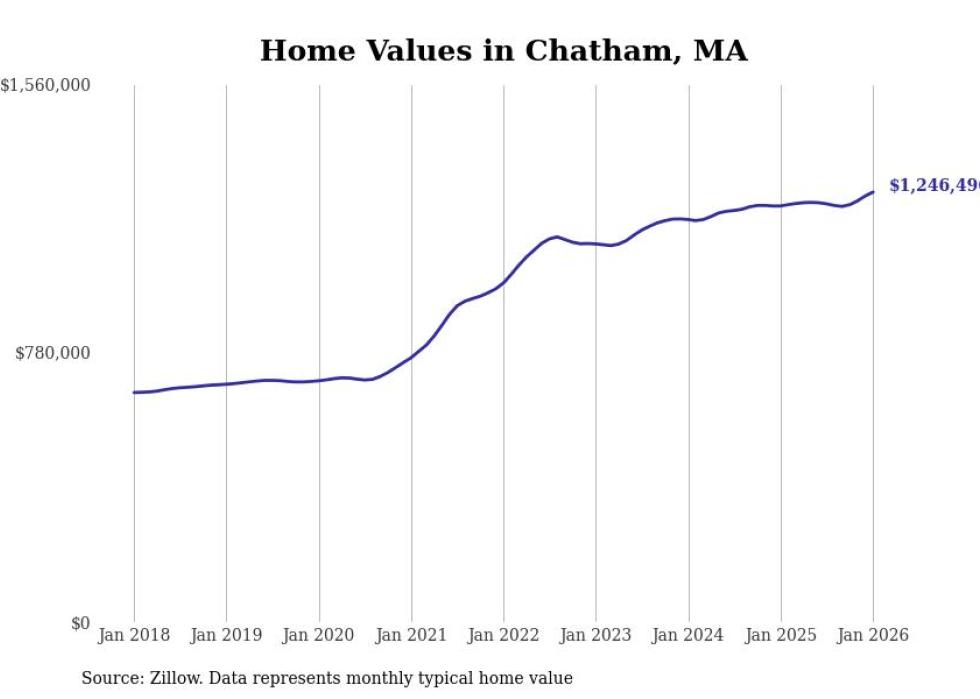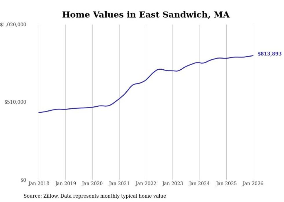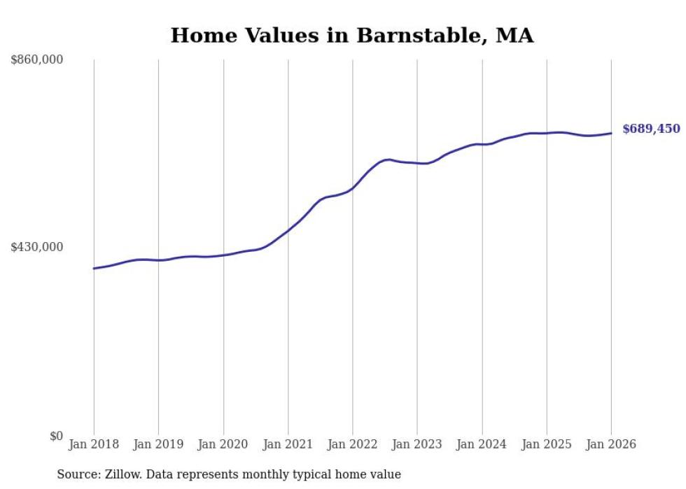 Stacker compiled a list of cities with the most expensive homes in the Barnstable Town, MA metro area using data from Zillow. Charts show the monthly typical home value since January 2018.