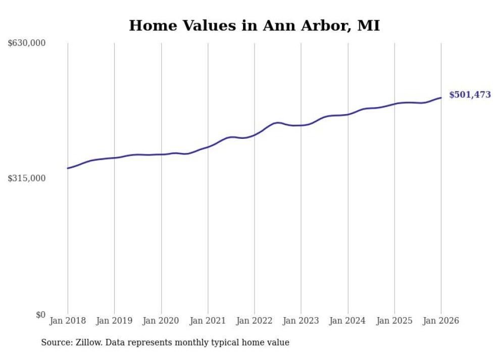 Stacker compiled a list of cities with the most expensive homes in the Ann Arbor, MI metro area using data from Zillow. Charts show the monthly typical home value since January 2018.