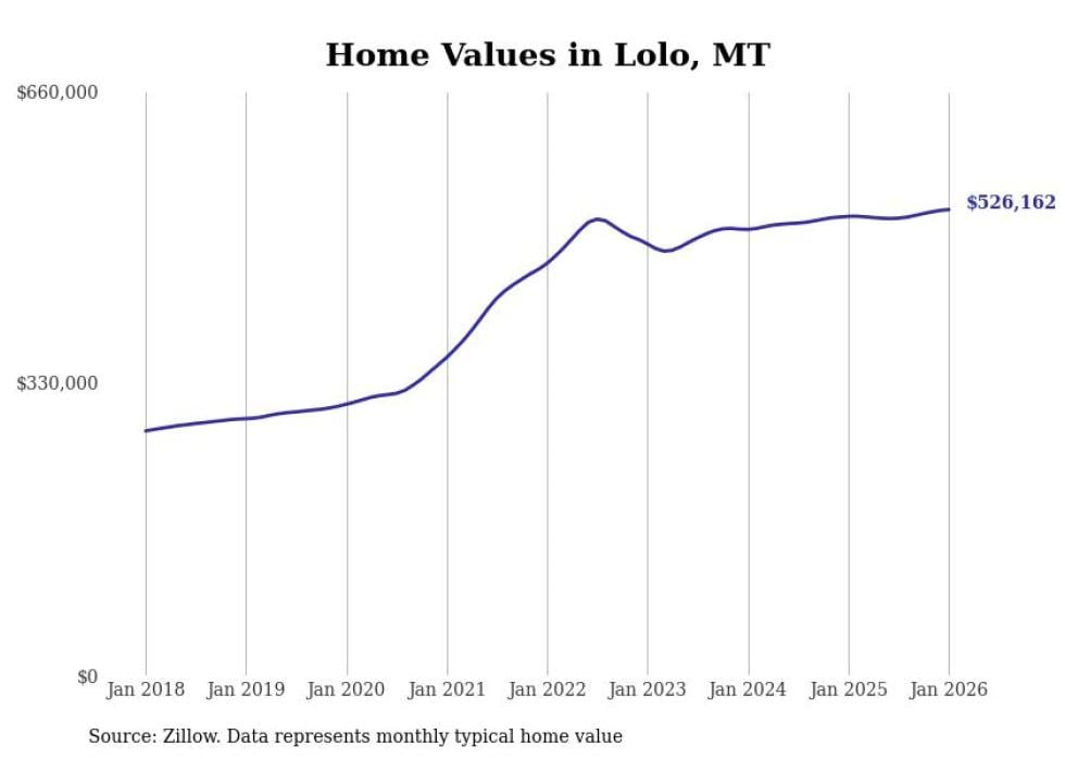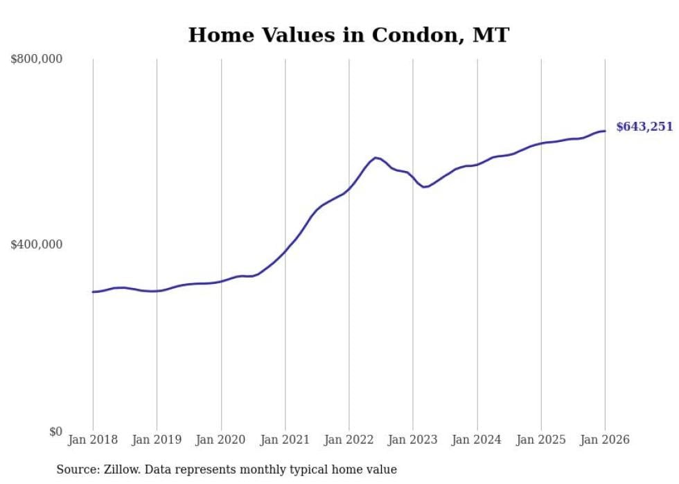 Stacker compiled a list of cities with the most expensive homes in the Missoula metro area using data from Zillow. Charts show the monthly typical home value since January 2018. All 11 cities and towns with data available were included in the list.
