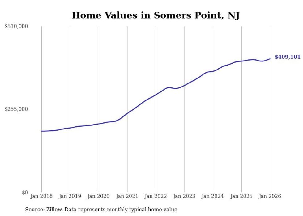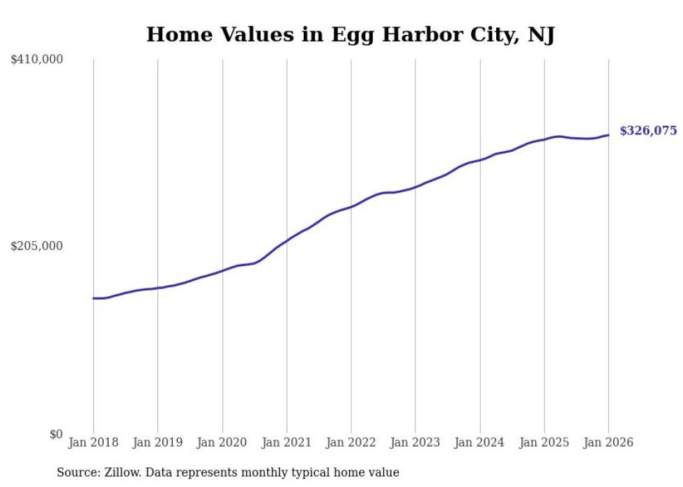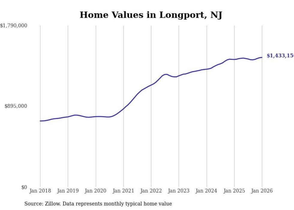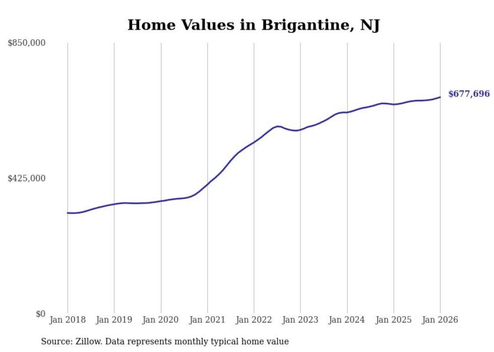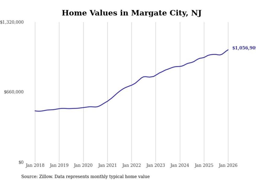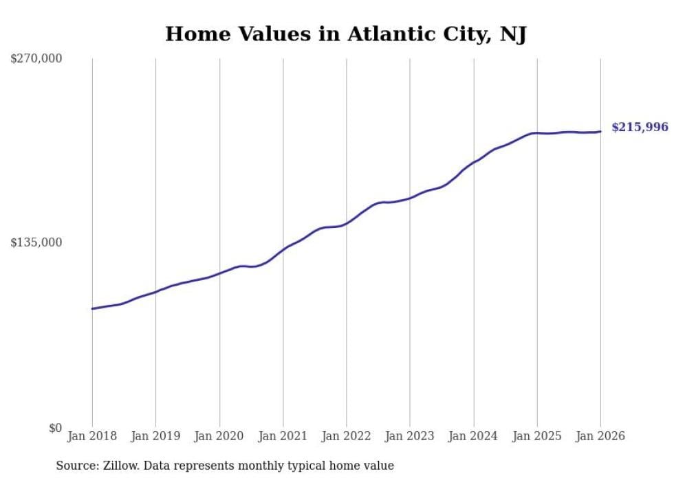 Stacker compiled a list of cities with the most expensive homes in the Atlantic City metro area using data from Zillow. Charts show the monthly typical home value since January 2018. All 18 cities and towns with data available were included in the list.