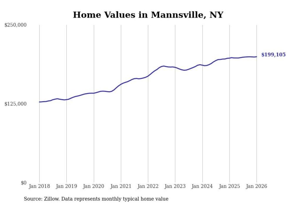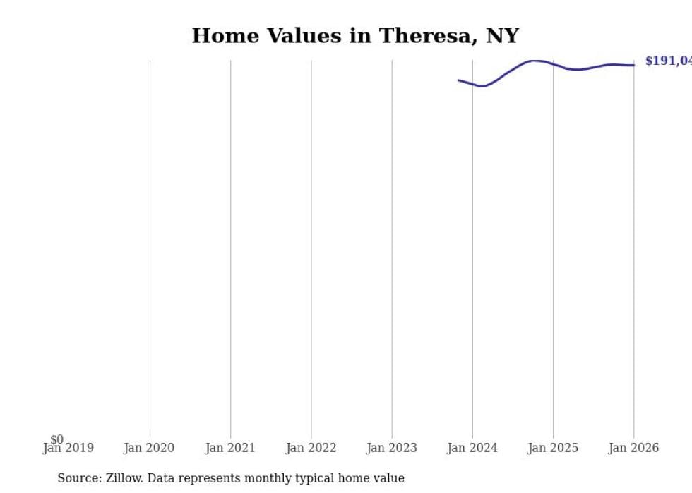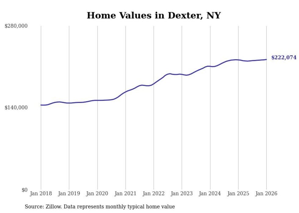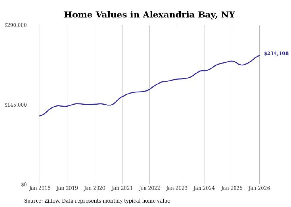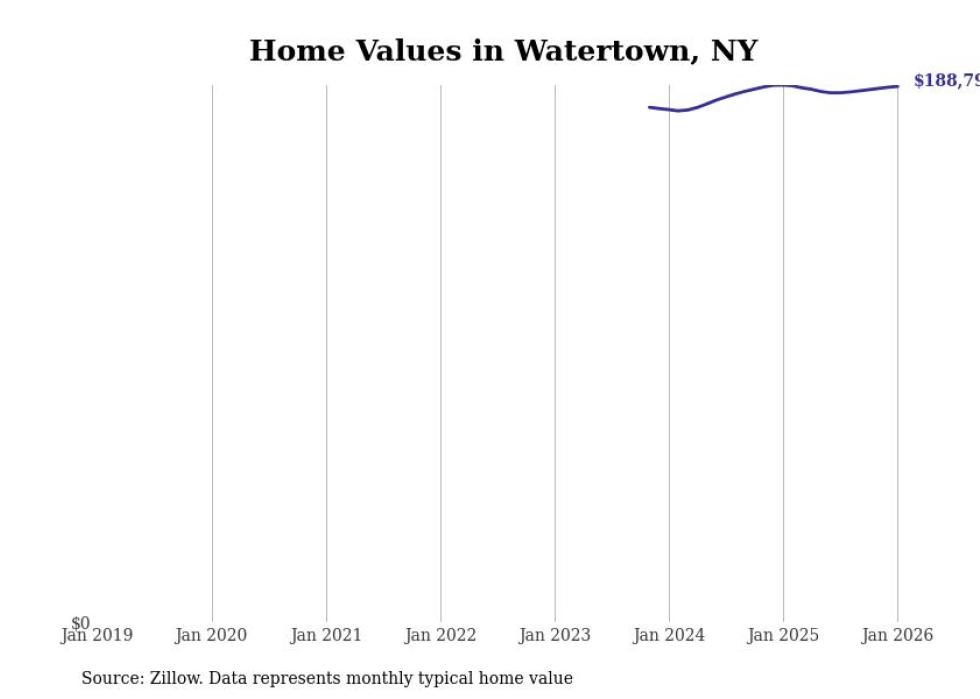 Stacker compiled a list of cities with the most expensive homes in the Watertown-Fort Drum, NY metro area using data from Zillow. Charts show the monthly typical home value since January 2018.