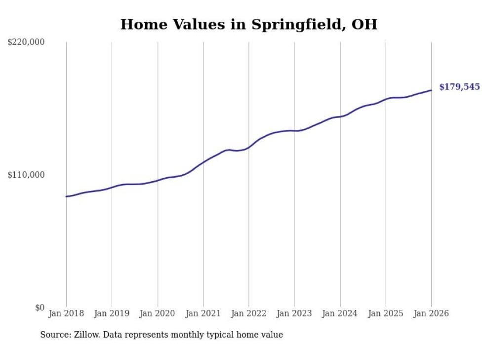 Stacker compiled a list of cities with the most expensive homes in the Springfield, Ohio metro area using data from Zillow. Charts show the monthly typical home value since January 2018. All 8 cities and towns with data available were included in the list.