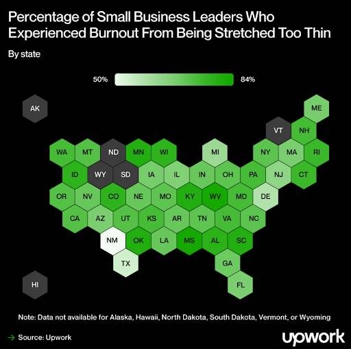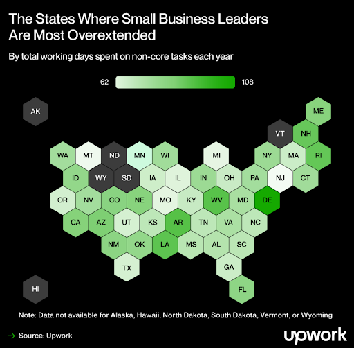 About 54% of SMB leaders in Oklahoma in Upwork's report said that tasks outside their core responsibilities take up time they could be spending on more strategic aspects of the business, and 56% believe that delegating more would help them achieve better results. Fully 66% knew just which tasks they would offload first if they could.