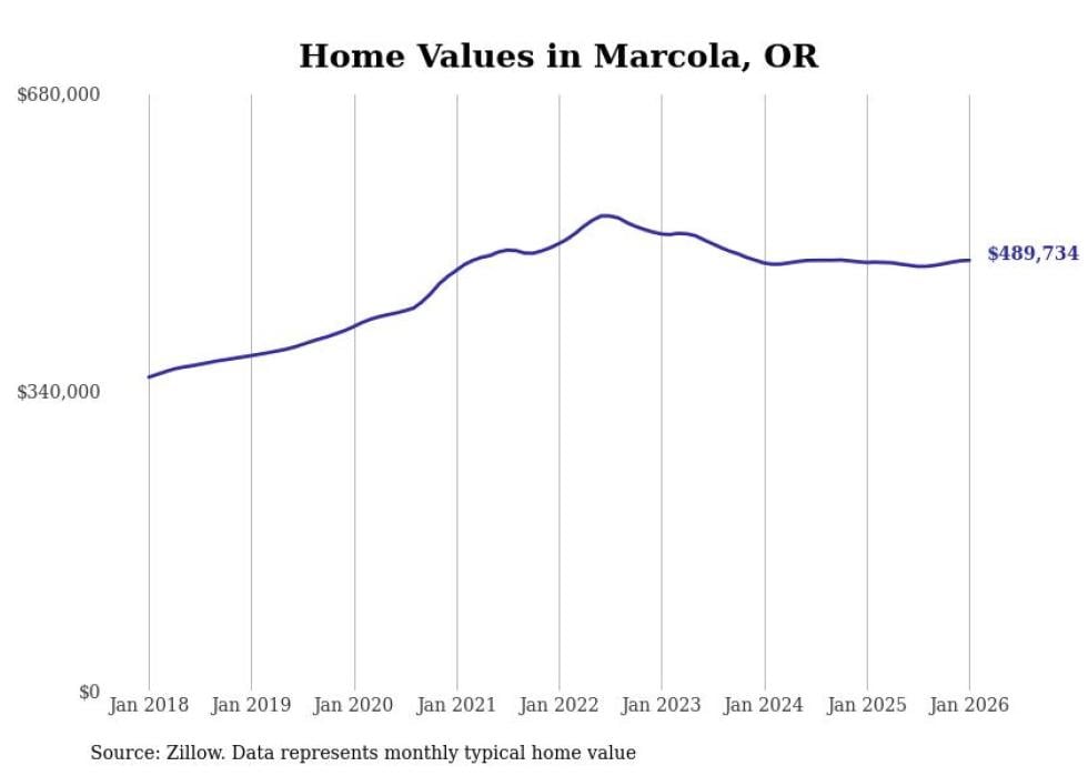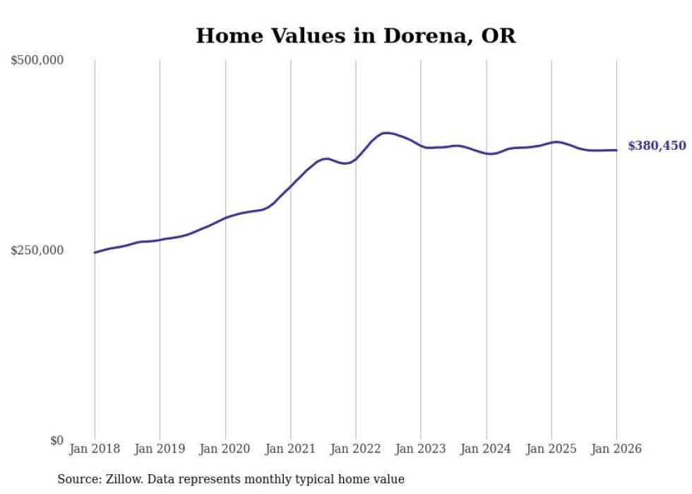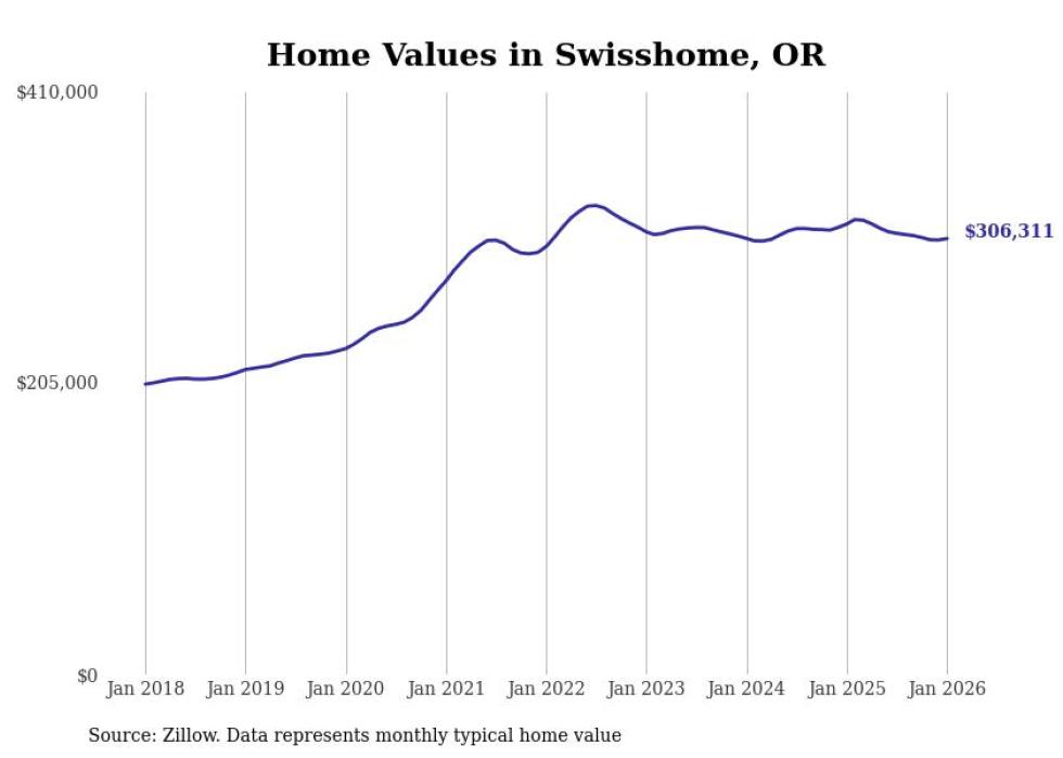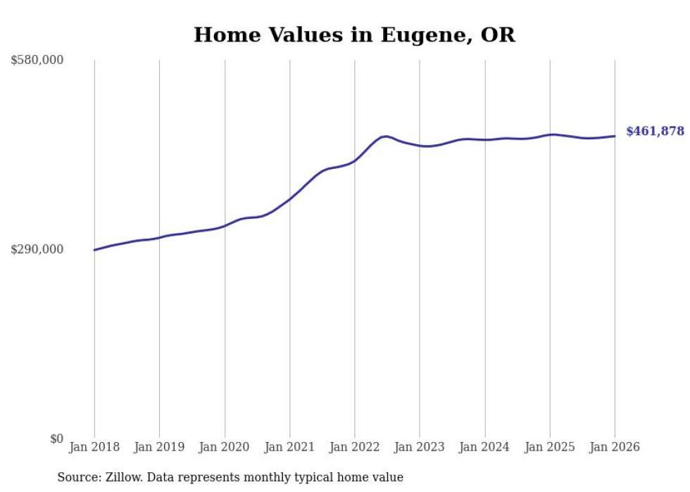 Stacker compiled a list of cities with the most expensive homes in the Eugene metro area using data from Zillow. Charts show the monthly typical home value since January 2018. All 25 cities and towns with data available were included in the list.