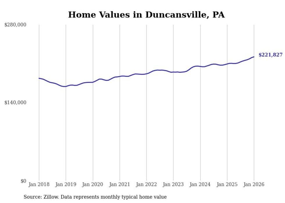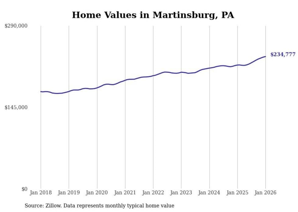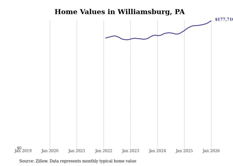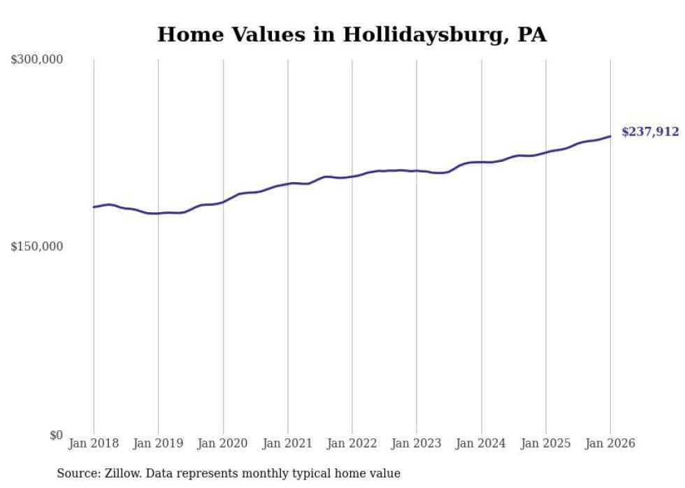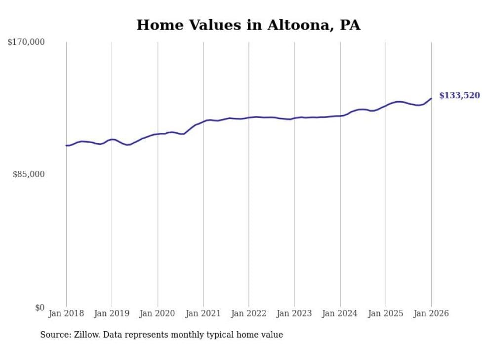 Stacker compiled a list of cities with the most expensive homes in the Altoona, PA metro area using data from Zillow. Charts show the monthly typical home value since January 2018.