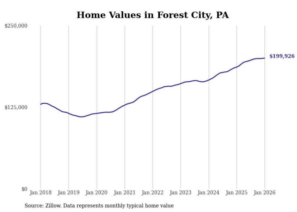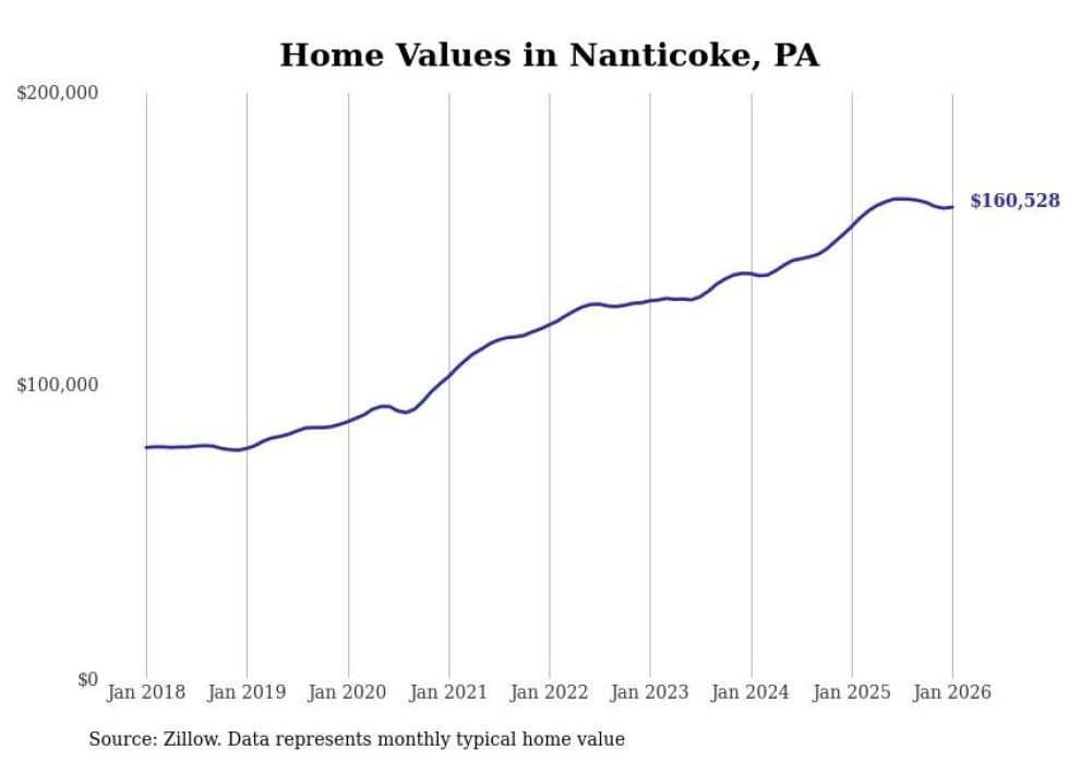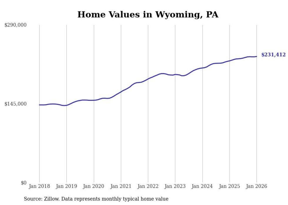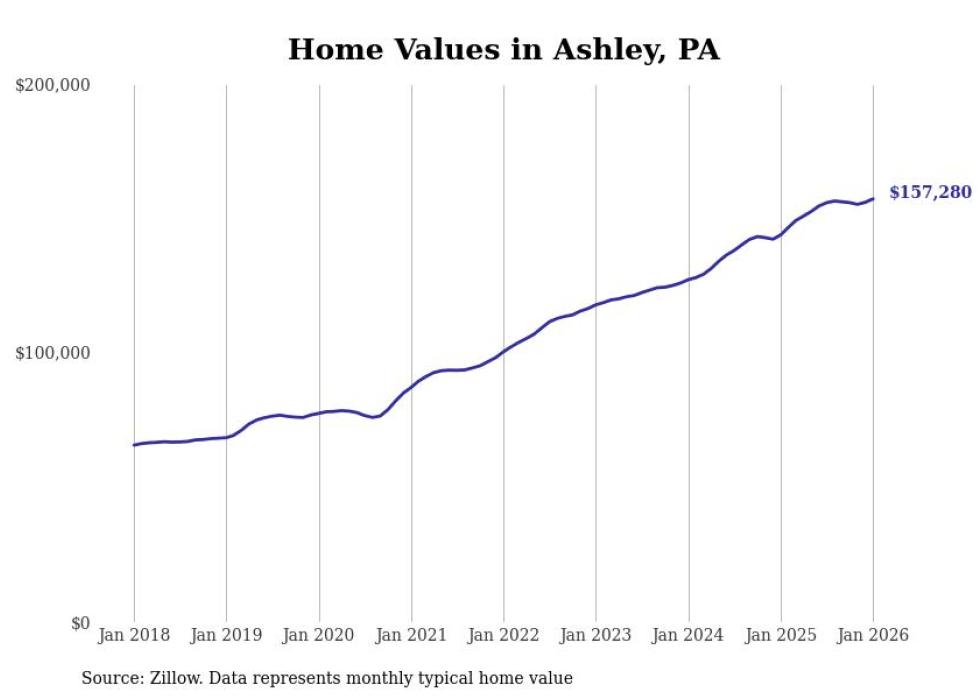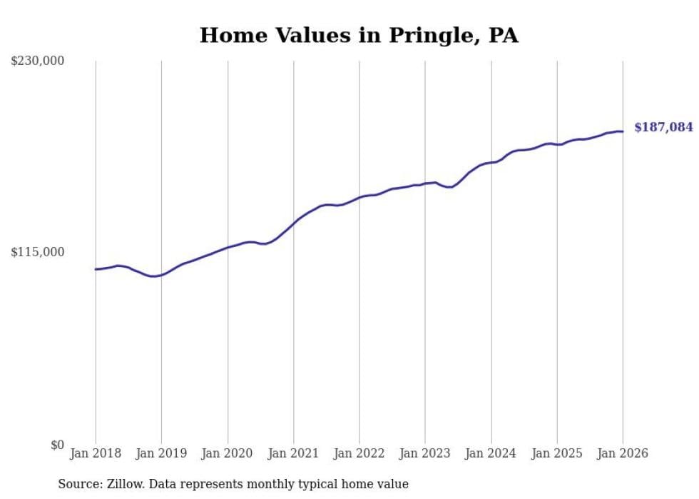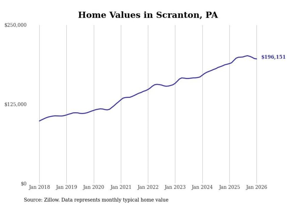 Stacker compiled a list of cities with the most expensive homes in the Scranton--Wilkes-Barre, PA metro area using data from Zillow. Charts show the monthly typical home value since January 2018.