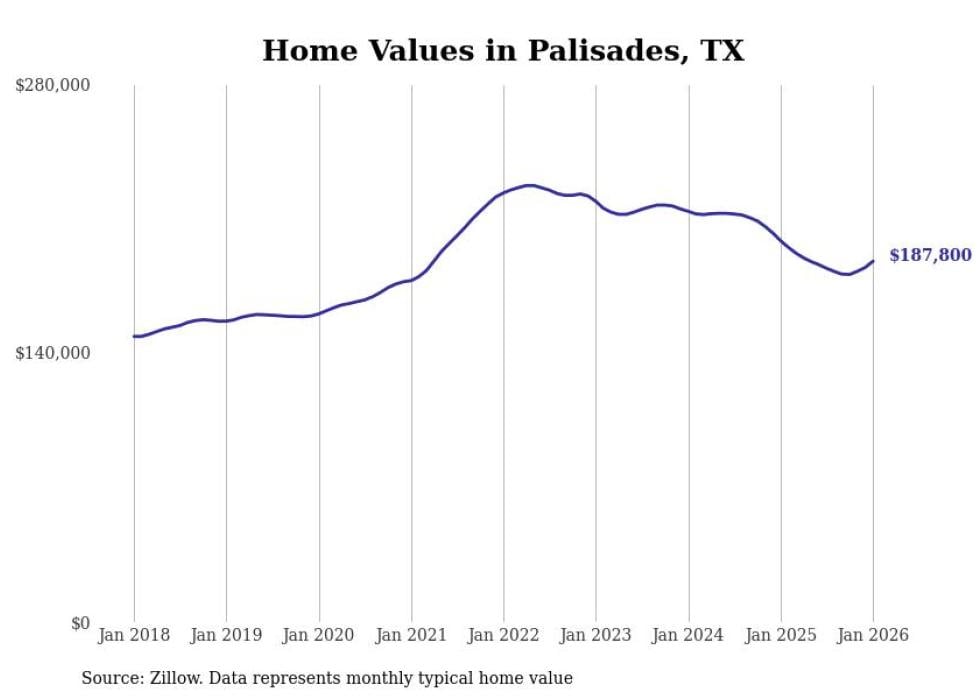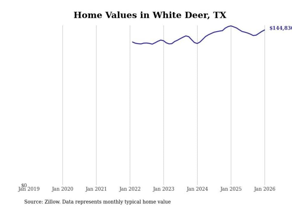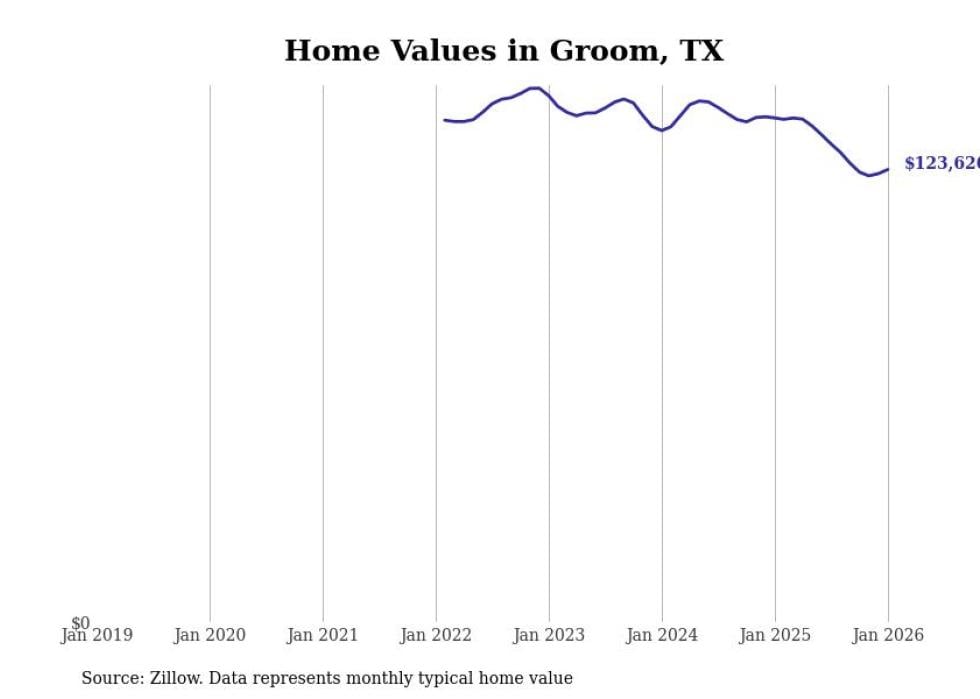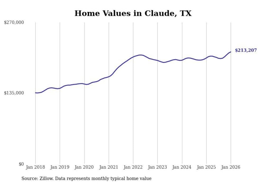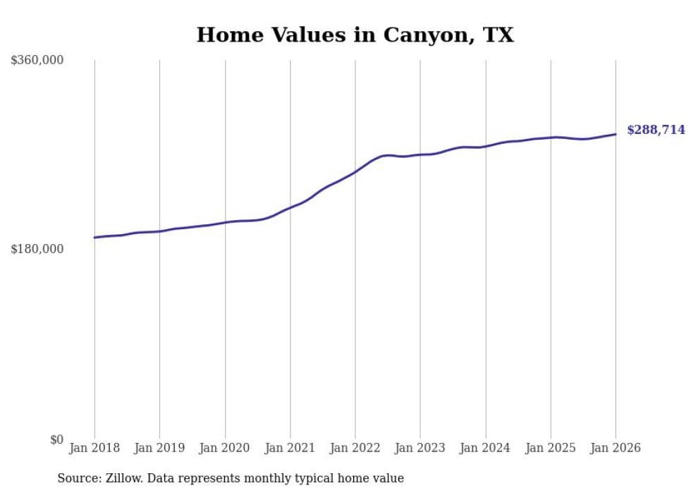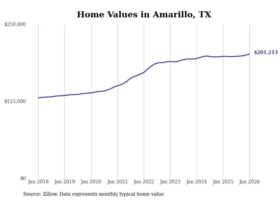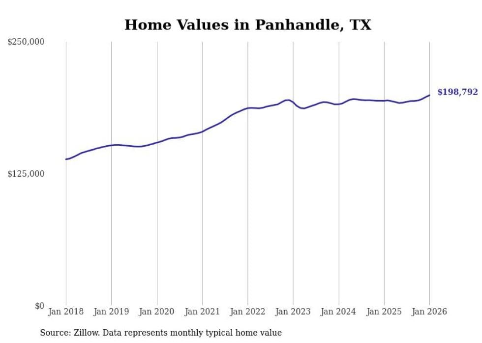 Stacker compiled a list of cities with the most expensive homes in the Amarillo metro area using data from Zillow. Charts show the monthly typical home value since January 2018. All 10 cities and towns with data available were included in the list.