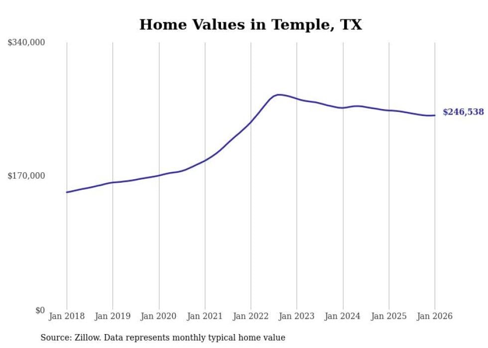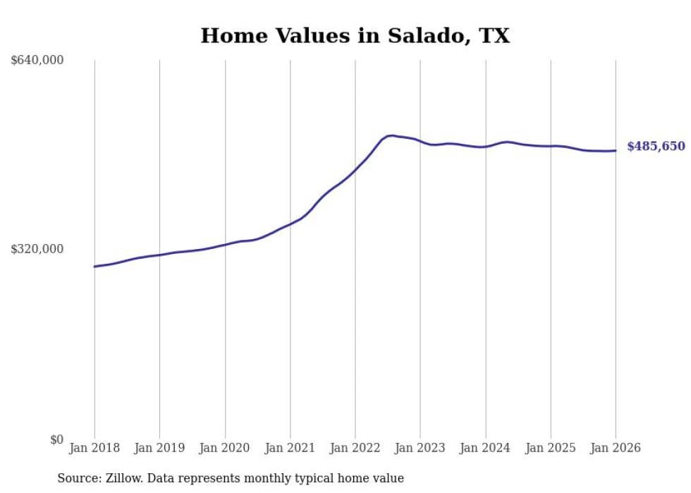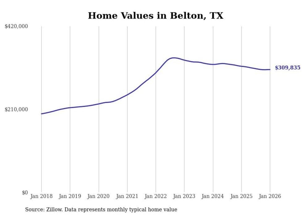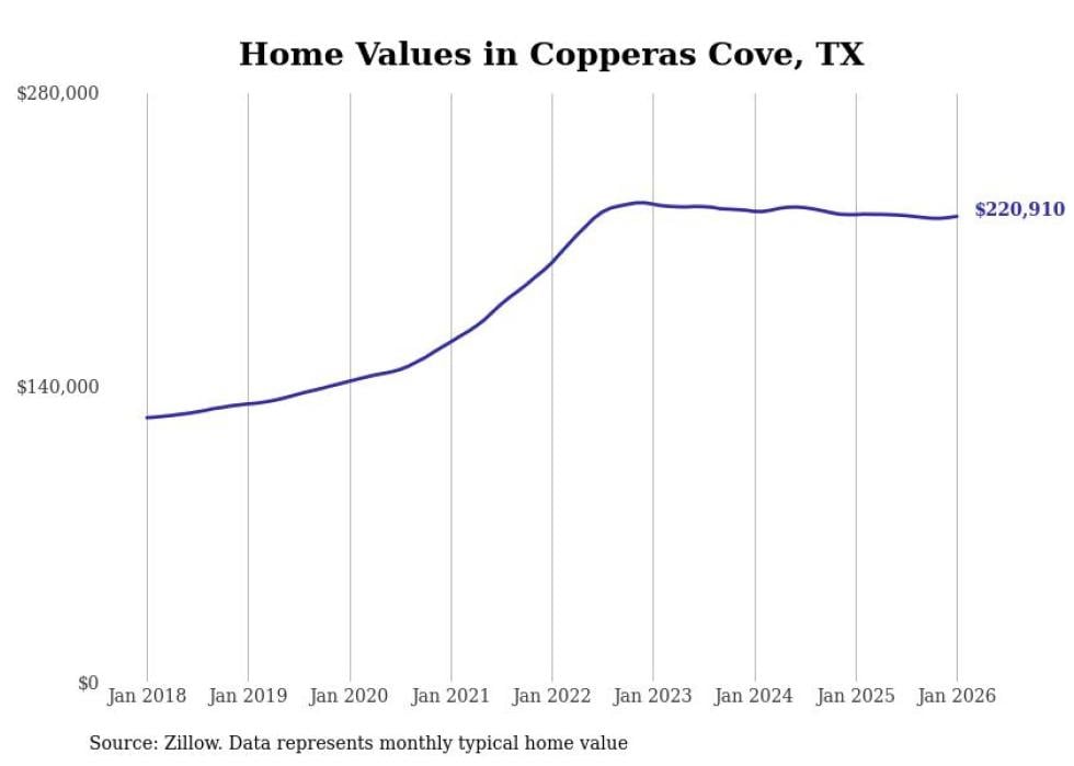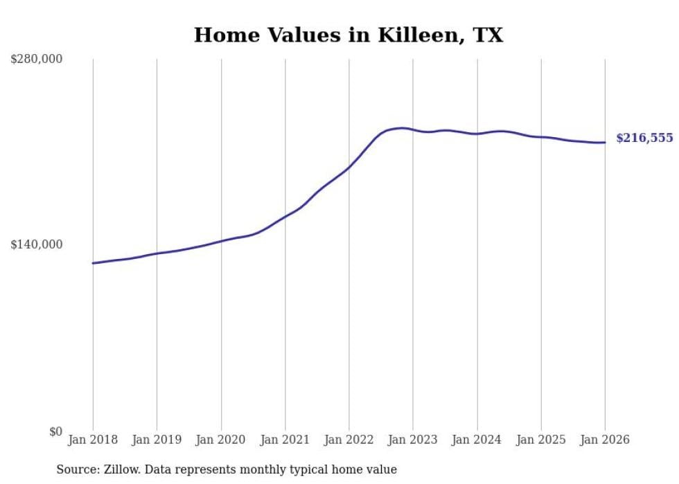 Stacker compiled a list of cities with the most expensive homes in the Killeen metro area using data from Zillow. Charts show the monthly typical home value since January 2018. All 24 cities and towns with data available were included in the list.