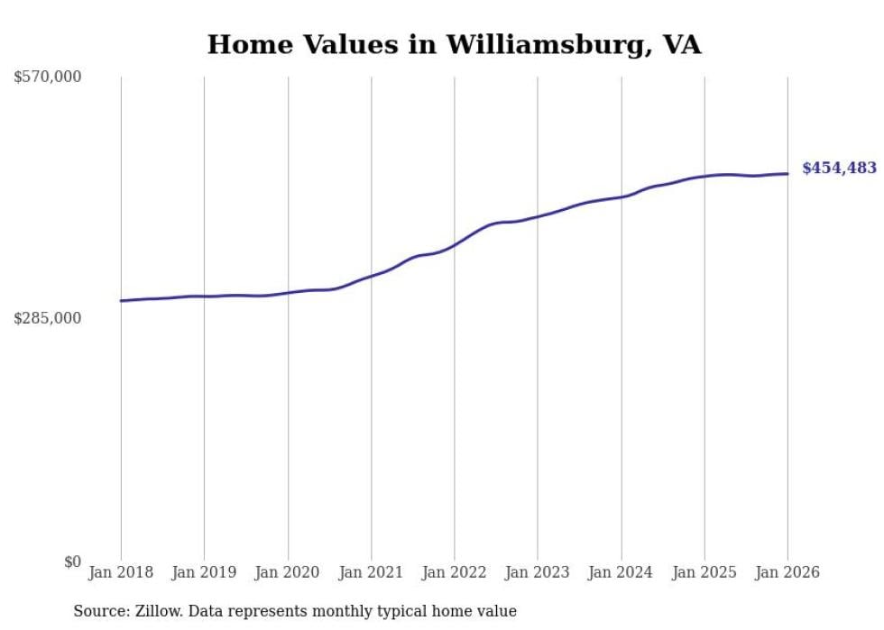 Stacker compiled a list of cities with the most expensive homes in the Norfolk metro area using data from Zillow. Charts show the monthly typical home value since January 2018. Data was available for 60 cities and towns.