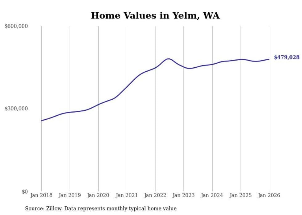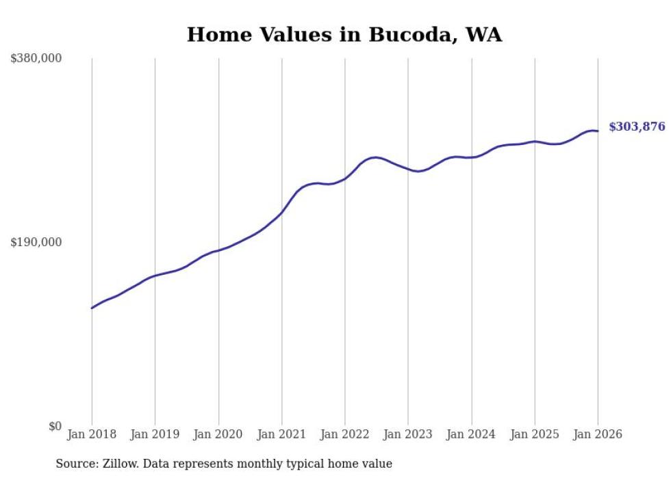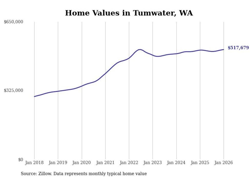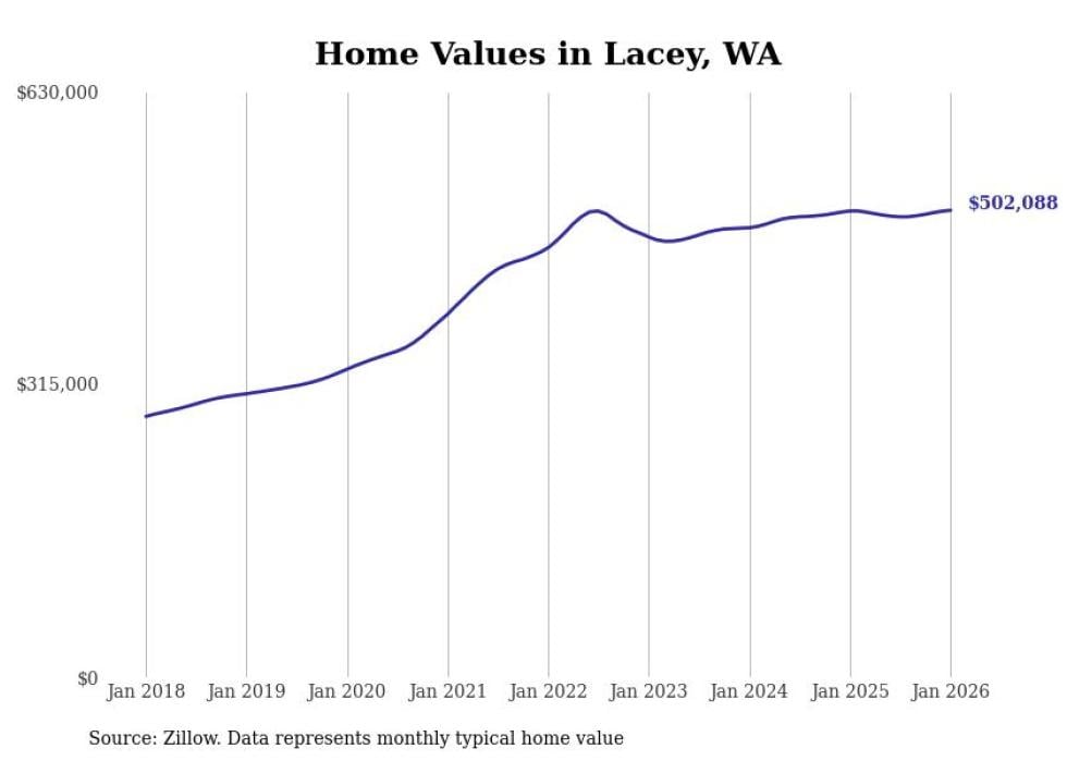 Stacker compiled a list of cities with the most expensive homes in the Olympia metro area using data from Zillow. Charts show the monthly typical home value since January 2018. All 8 cities and towns with data available were included in the list.