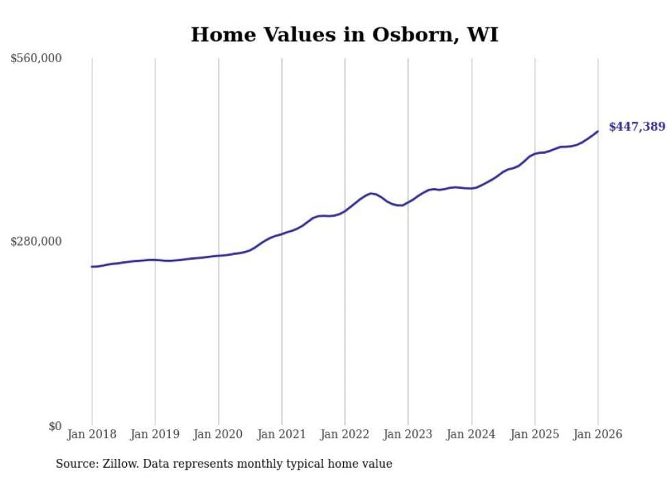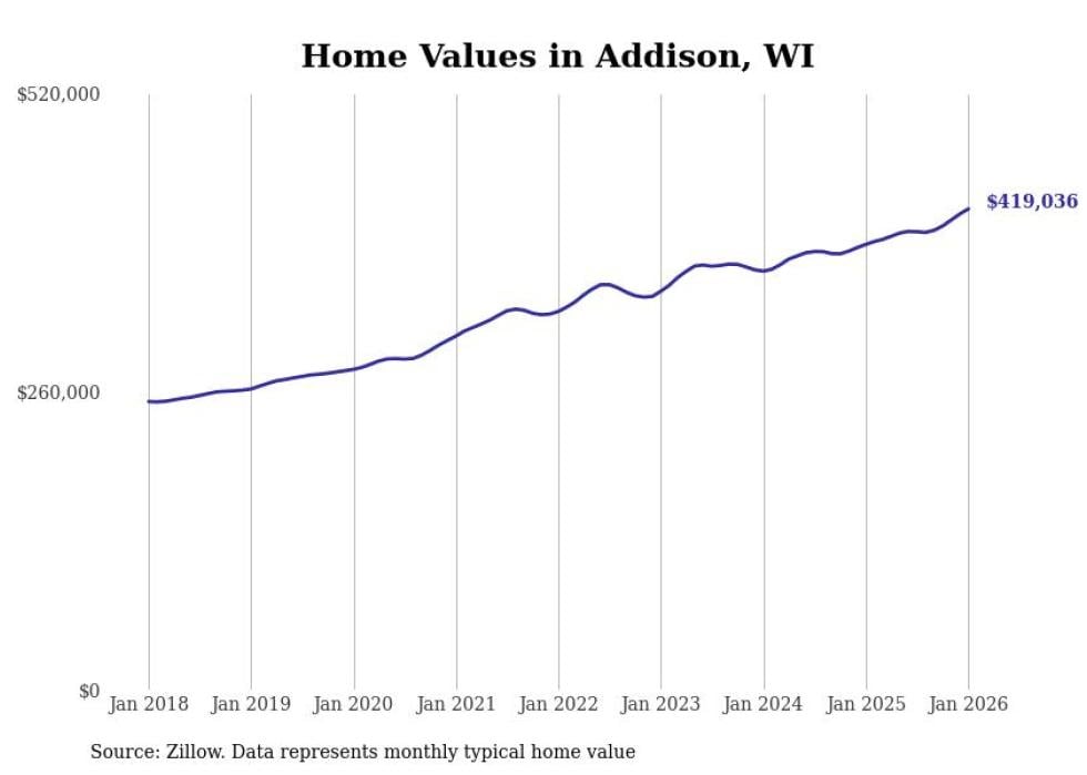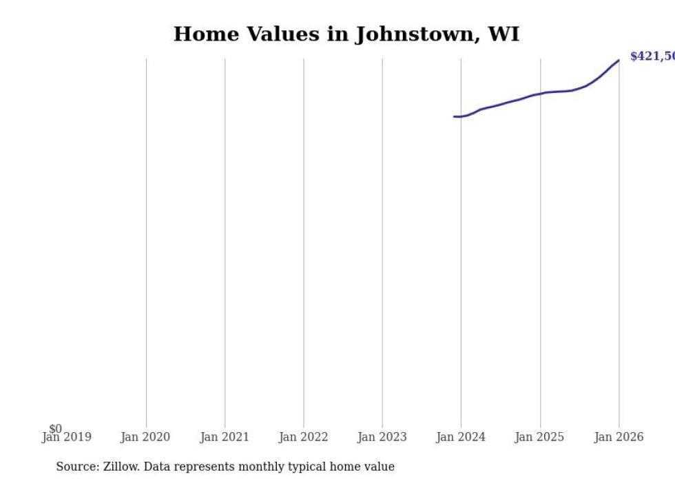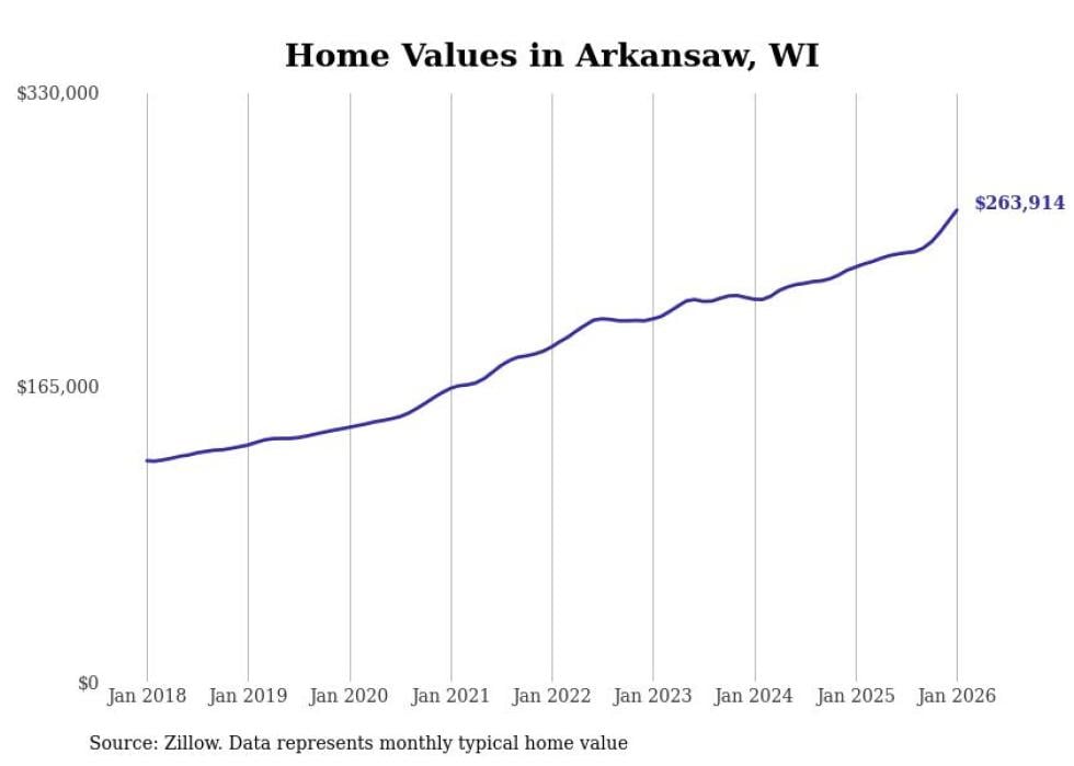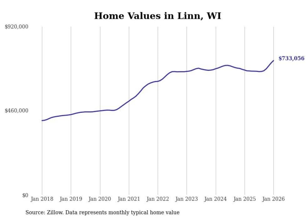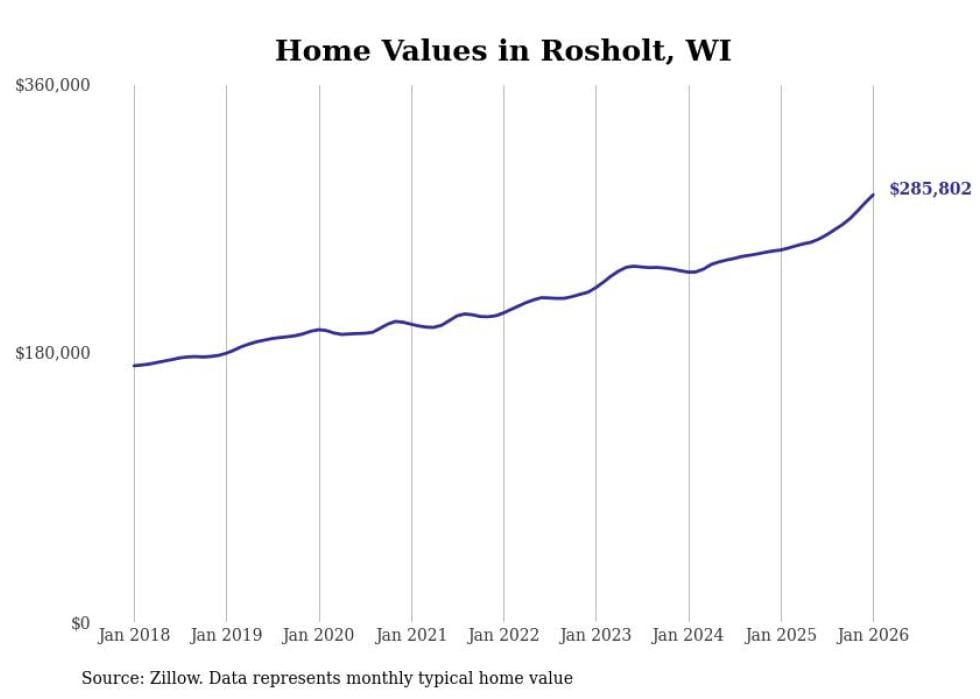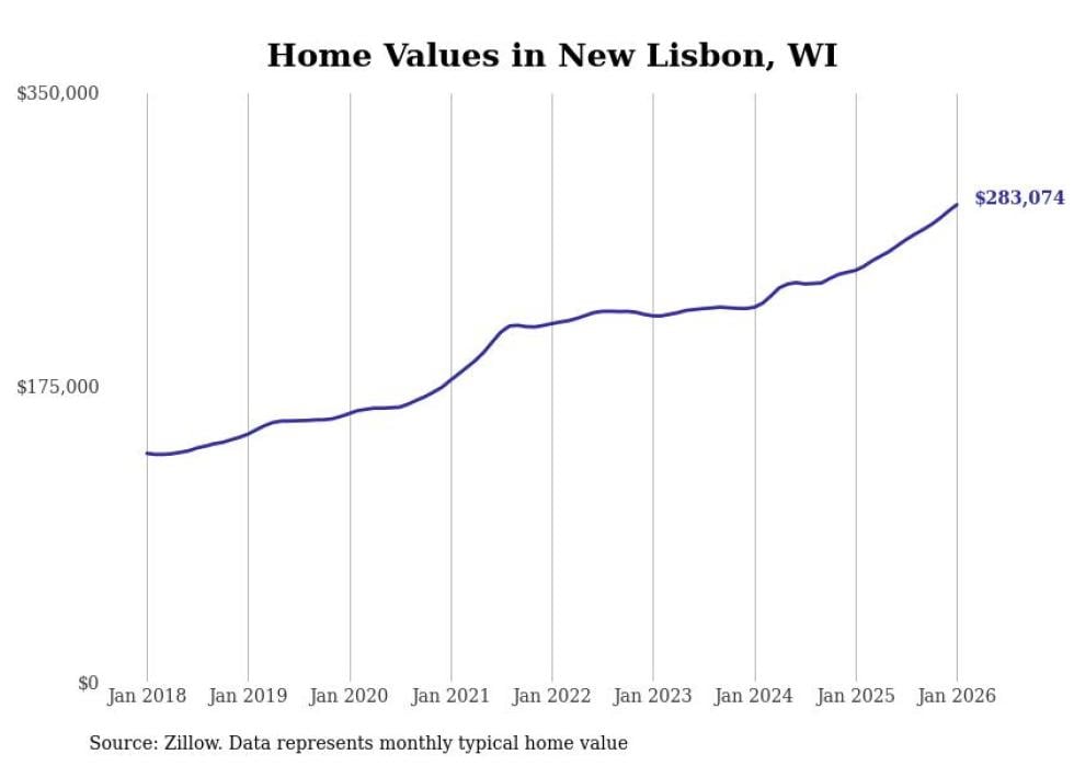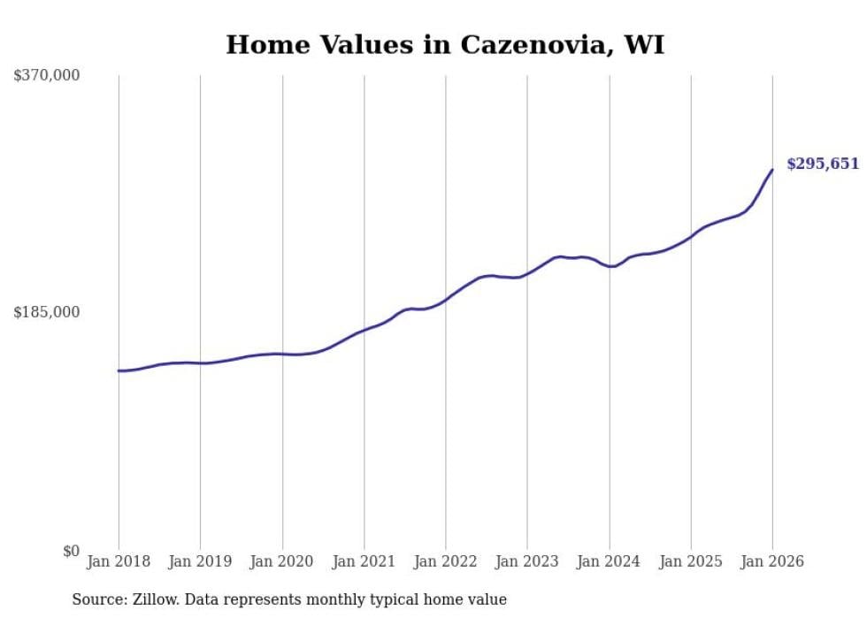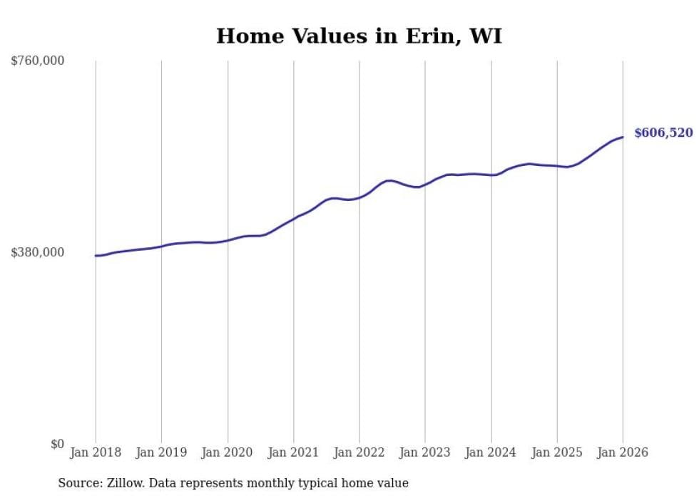 Stacker compiled a list of cities with the fastest-growing home prices in Wisconsin using data from Zillow. Cities are ranked by the dollar change in the Zillow Home Values Index for all homes from the 12 months ending January 2026. The charts in this story were created automatically using Matplotlib. Data was available for 50 cities and towns in Wisconsin.