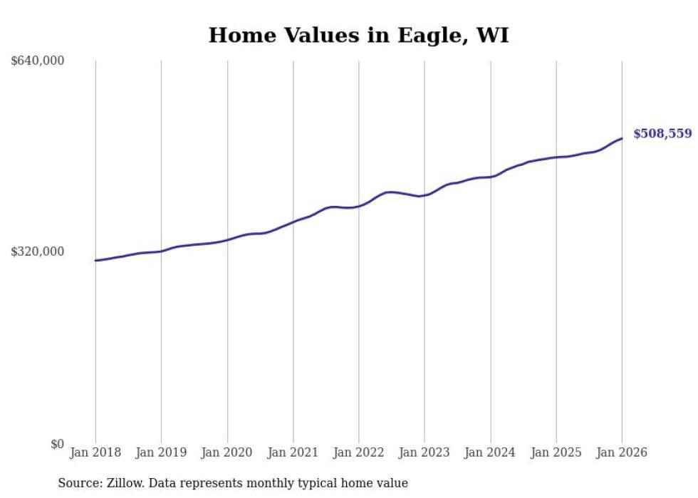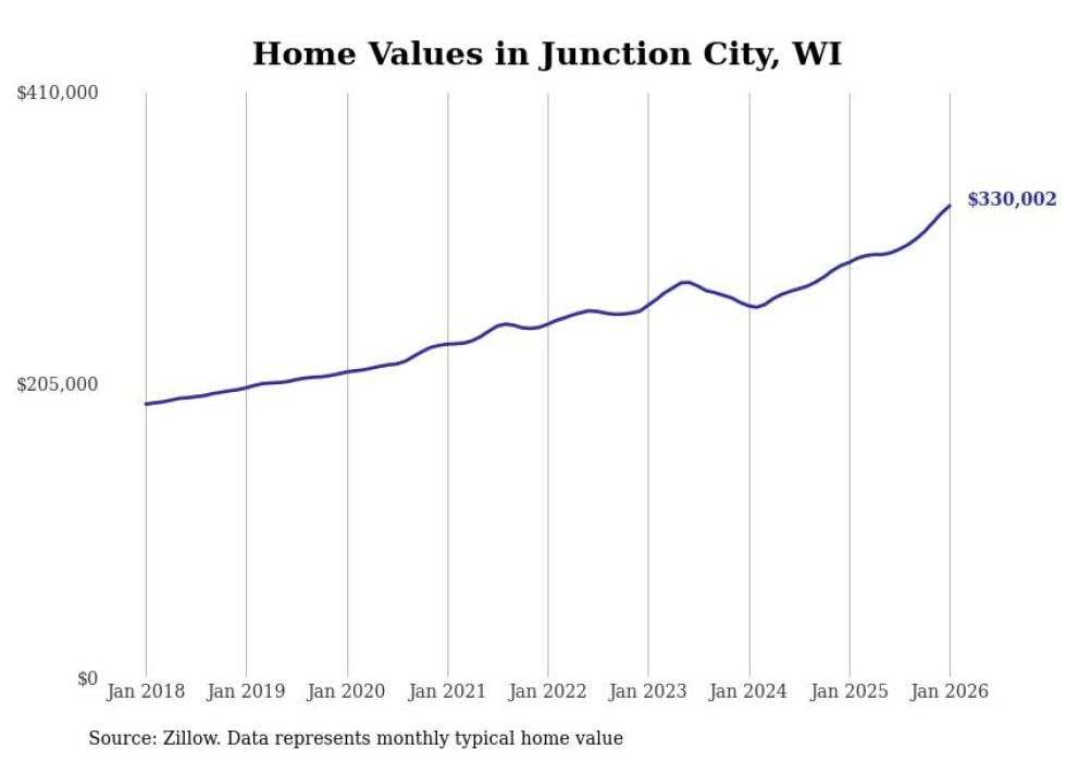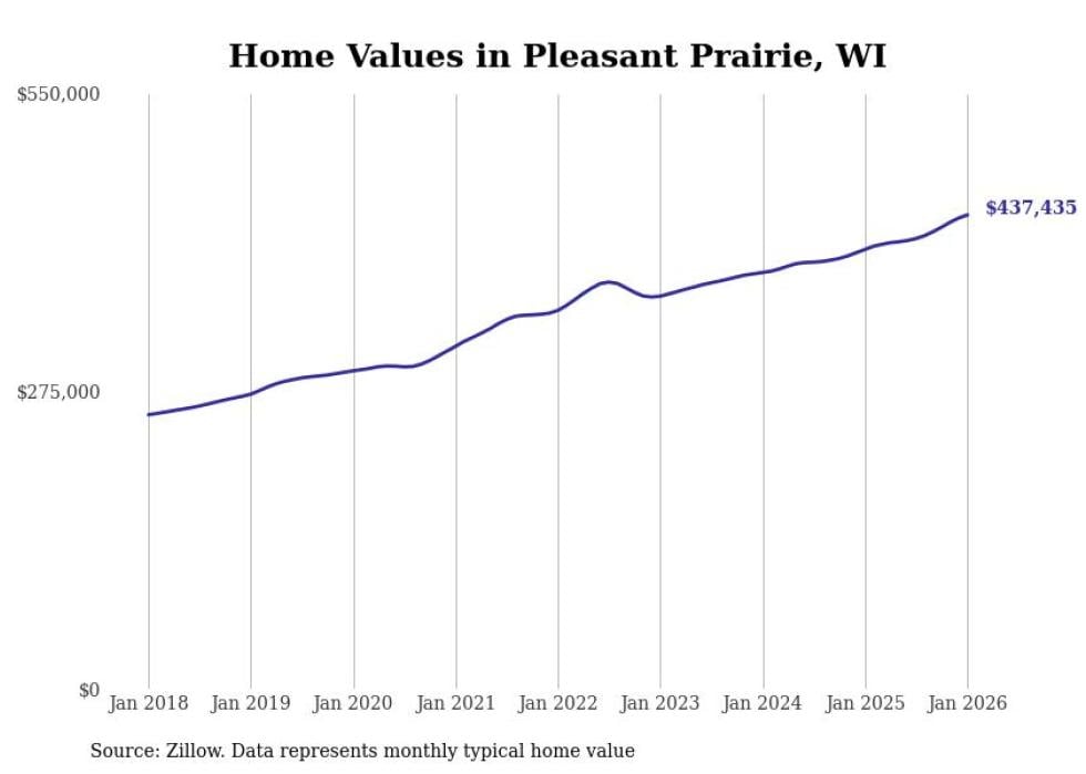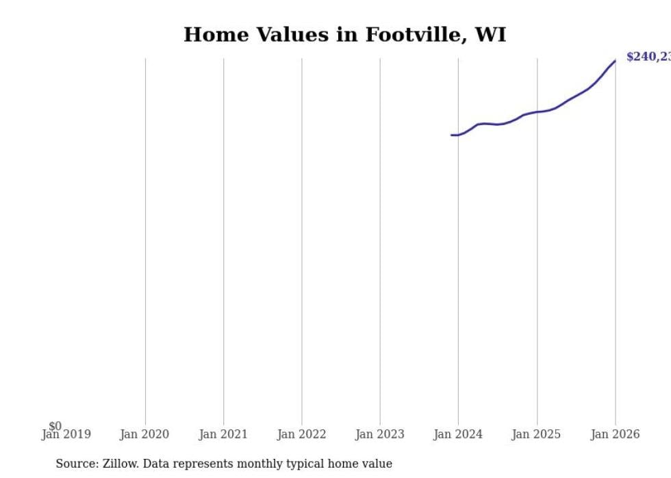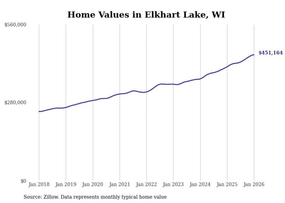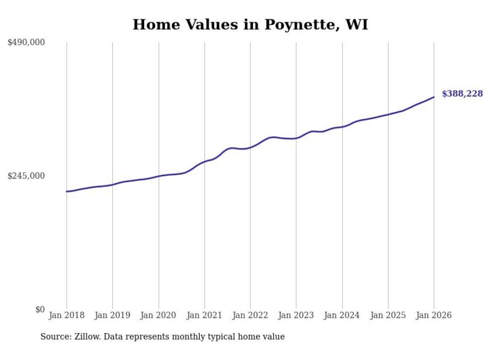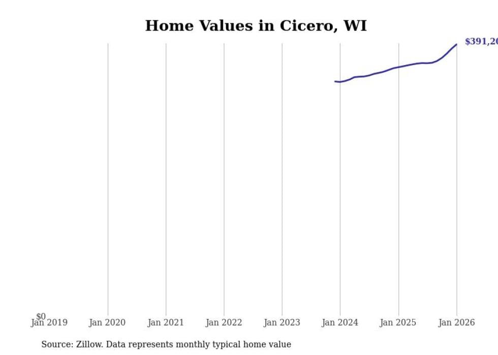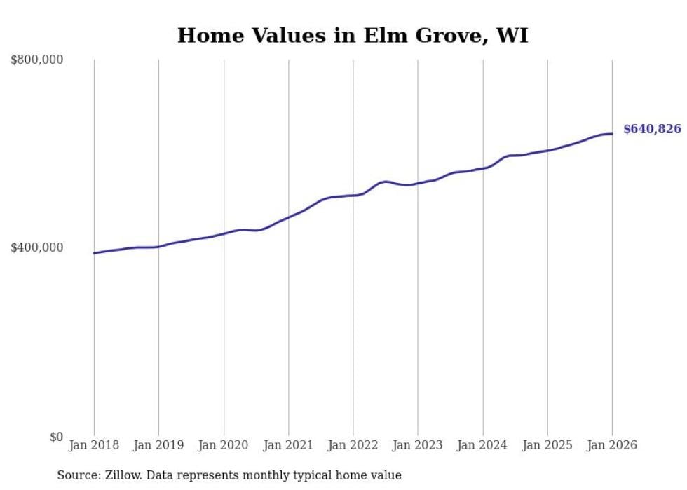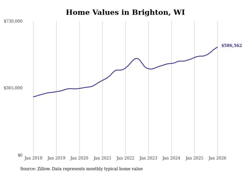 Stacker compiled a list of cities with the fastest-growing home prices in Wisconsin using data from Zillow. Cities are ranked by the dollar change in the Zillow Home Values Index for all homes from the 12 months ending January 2026. The charts in this story were created automatically using Matplotlib. Data was available for 50 cities and towns in Wisconsin.