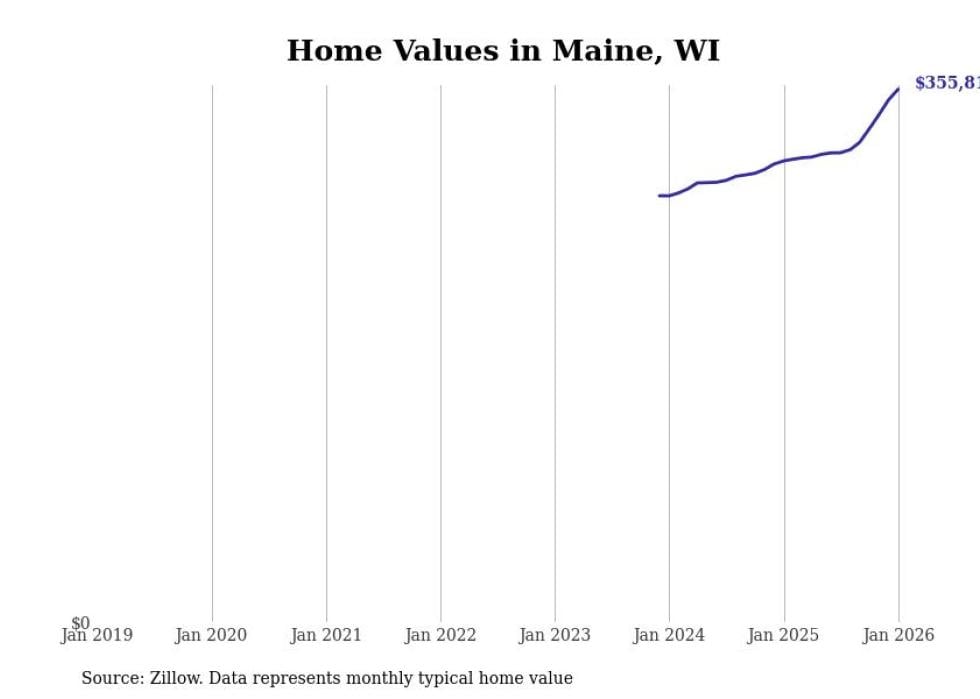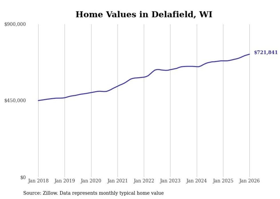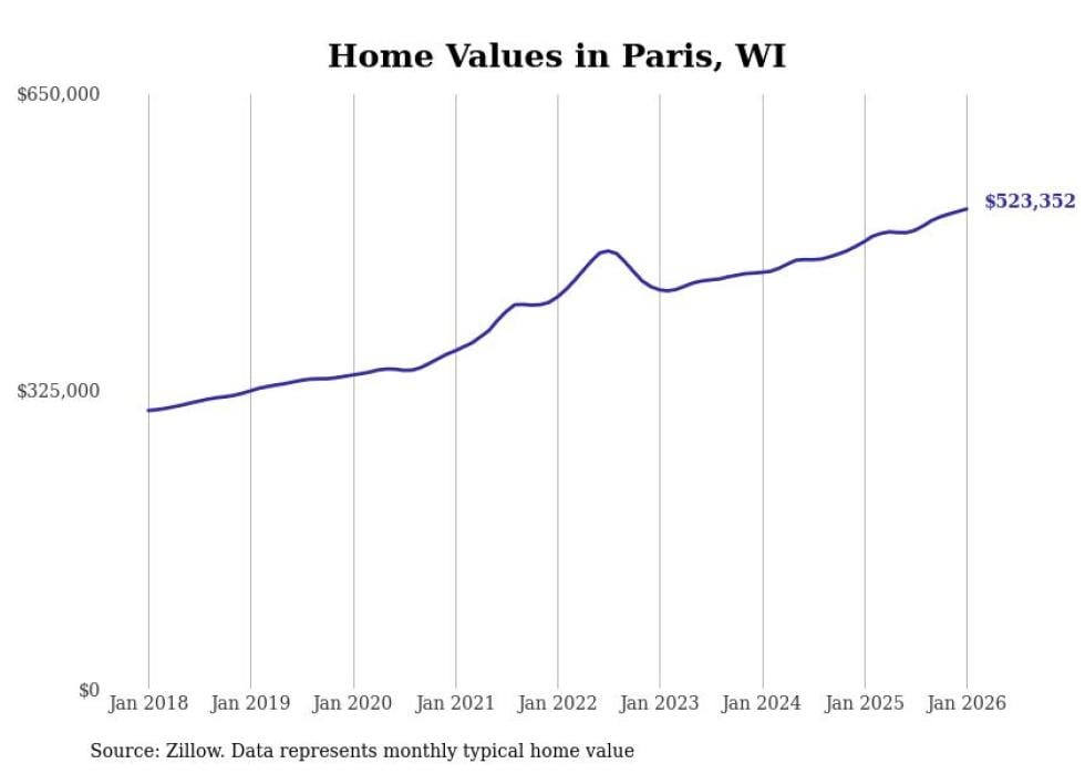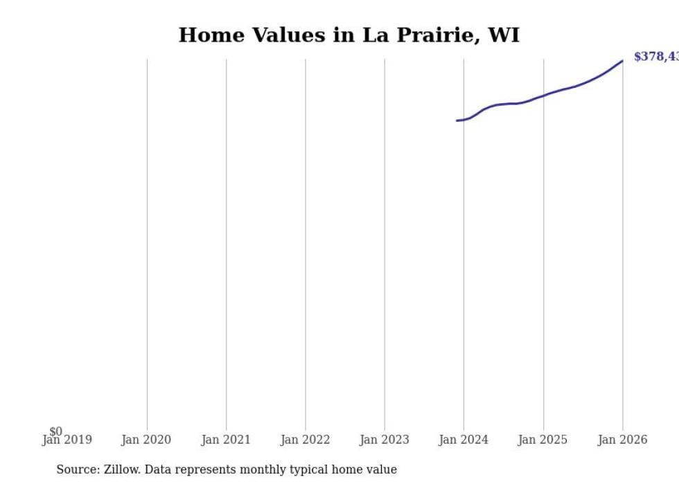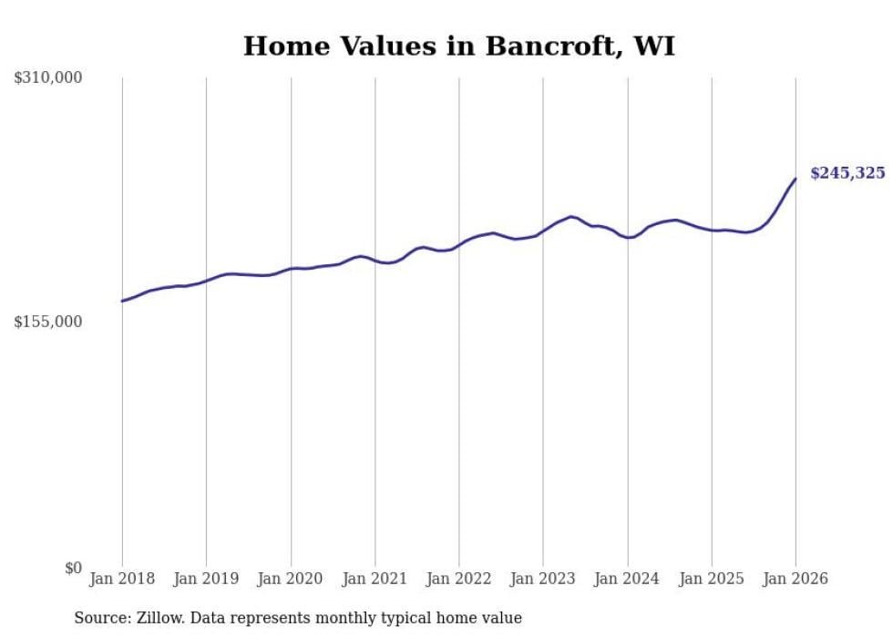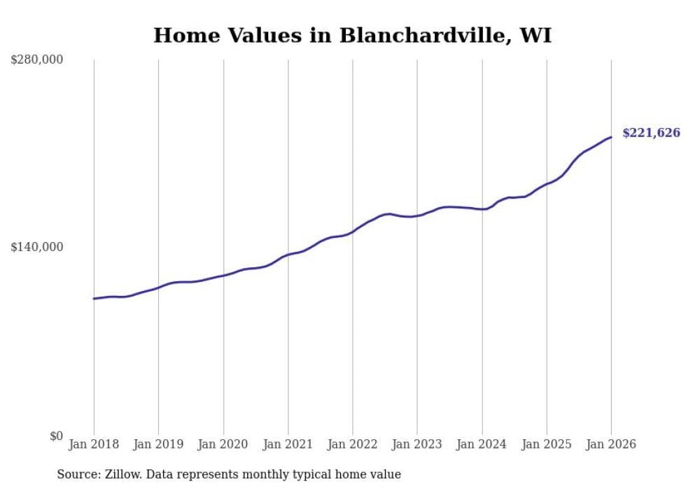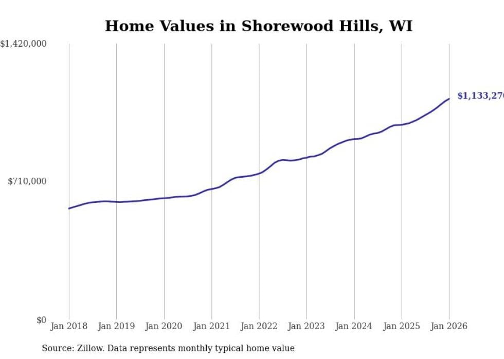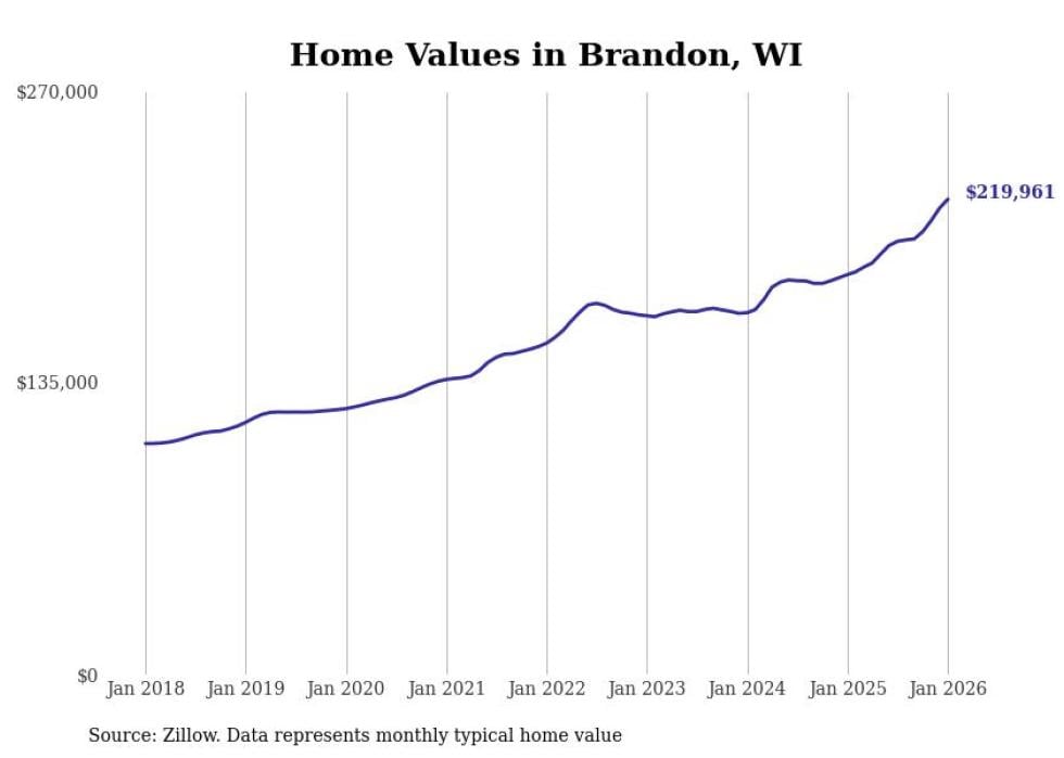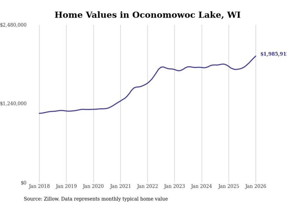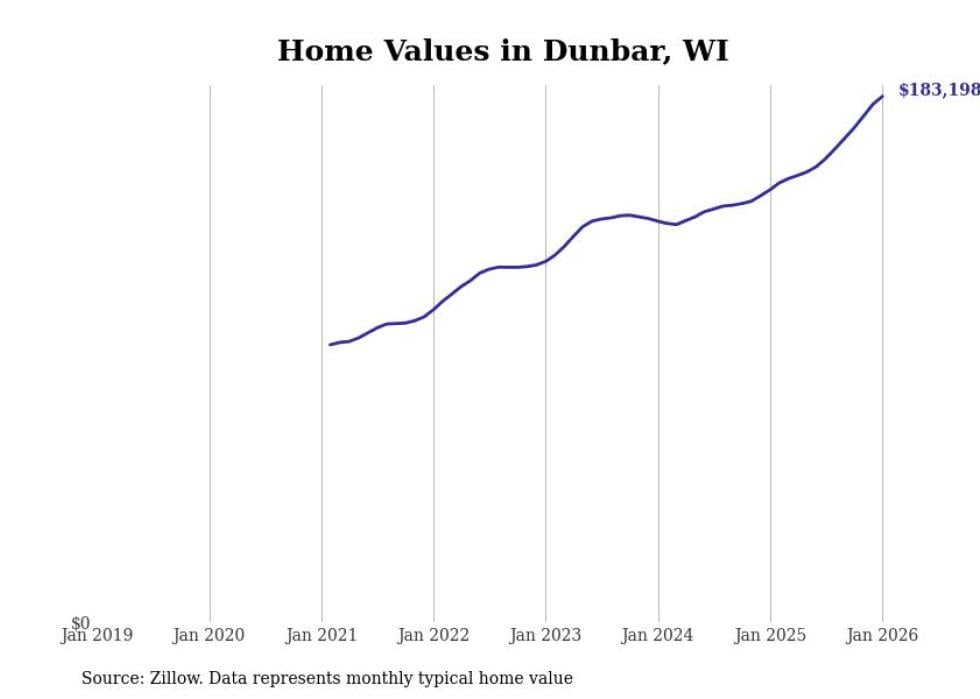 Stacker compiled a list of cities with the fastest-growing home prices in Wisconsin using data from Zillow. Cities are ranked by the dollar change in the Zillow Home Values Index for all homes from the 12 months ending January 2026. The charts in this story were created automatically using Matplotlib. Data was available for 50 cities and towns in Wisconsin.