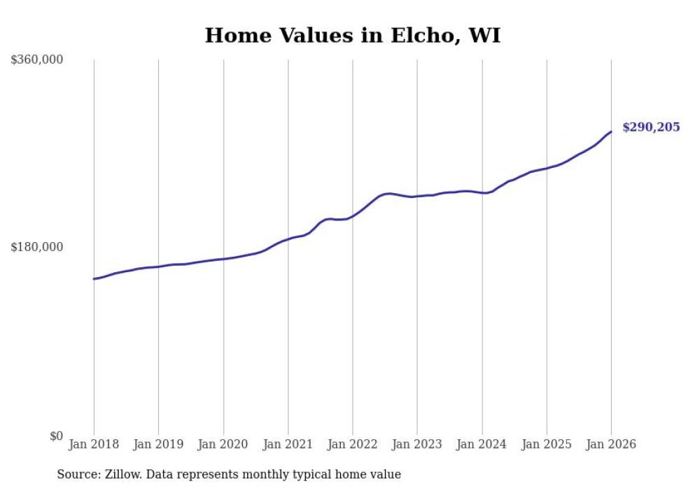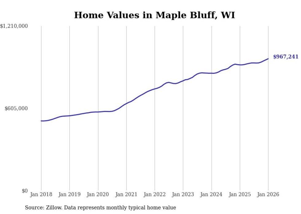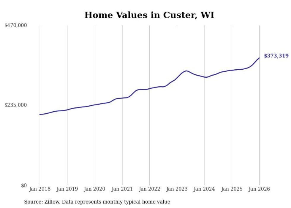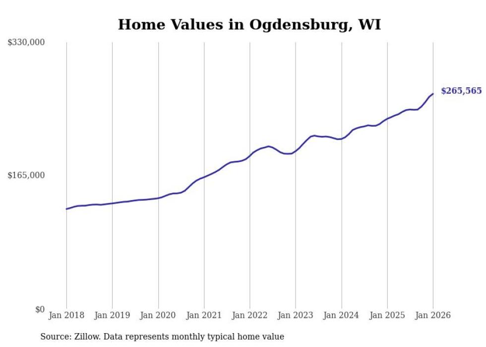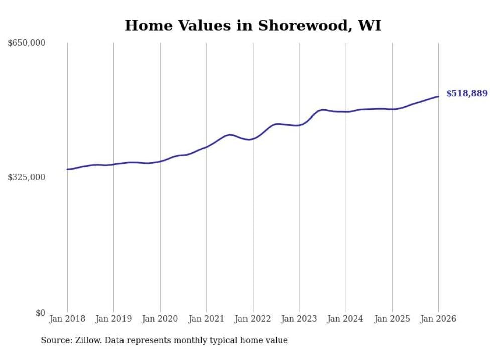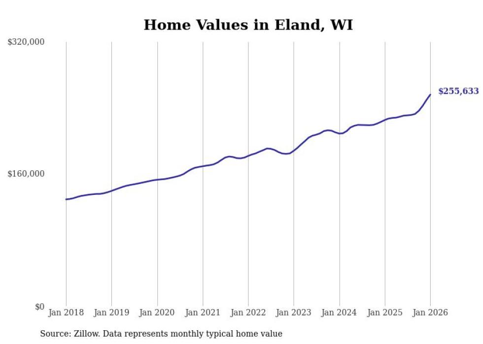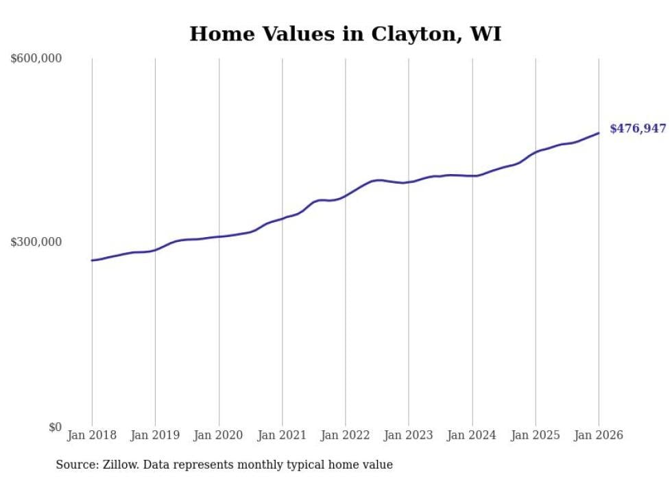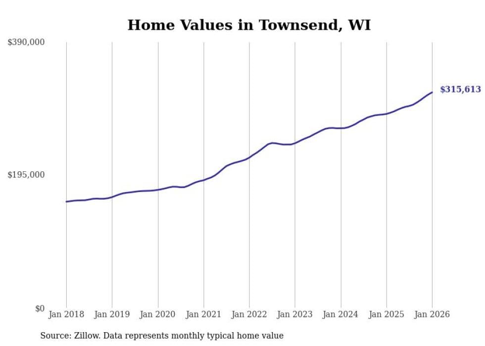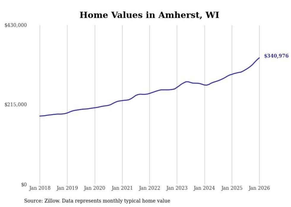 Stacker compiled a list of cities with the fastest-growing home prices in Wisconsin using data from Zillow. Cities are ranked by the dollar change in the Zillow Home Values Index for all homes from the 12 months ending January 2026. The charts in this story were created automatically using Matplotlib. Data was available for 50 cities and towns in Wisconsin.